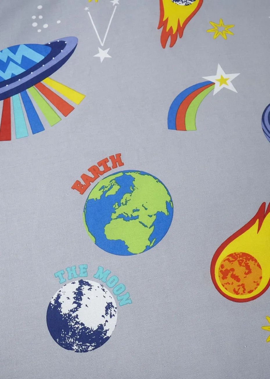 Transform your child’s room into something that’s out of this world. Featuring colourful illustrations of planets, rockets, astronauts, and spaceships set against a grey base, this sheeting is perfect for little adventurers. Created from easy-care recycled polyester and soft responsibly sourced cotton, blended together for everyday use. Catherine Lansfield is renowned for style and quality – designed and developed in Great Britain. Made to quality and human-ecological safety standards, in accordance with MADE IN GREEN by OEKO-TEX®.