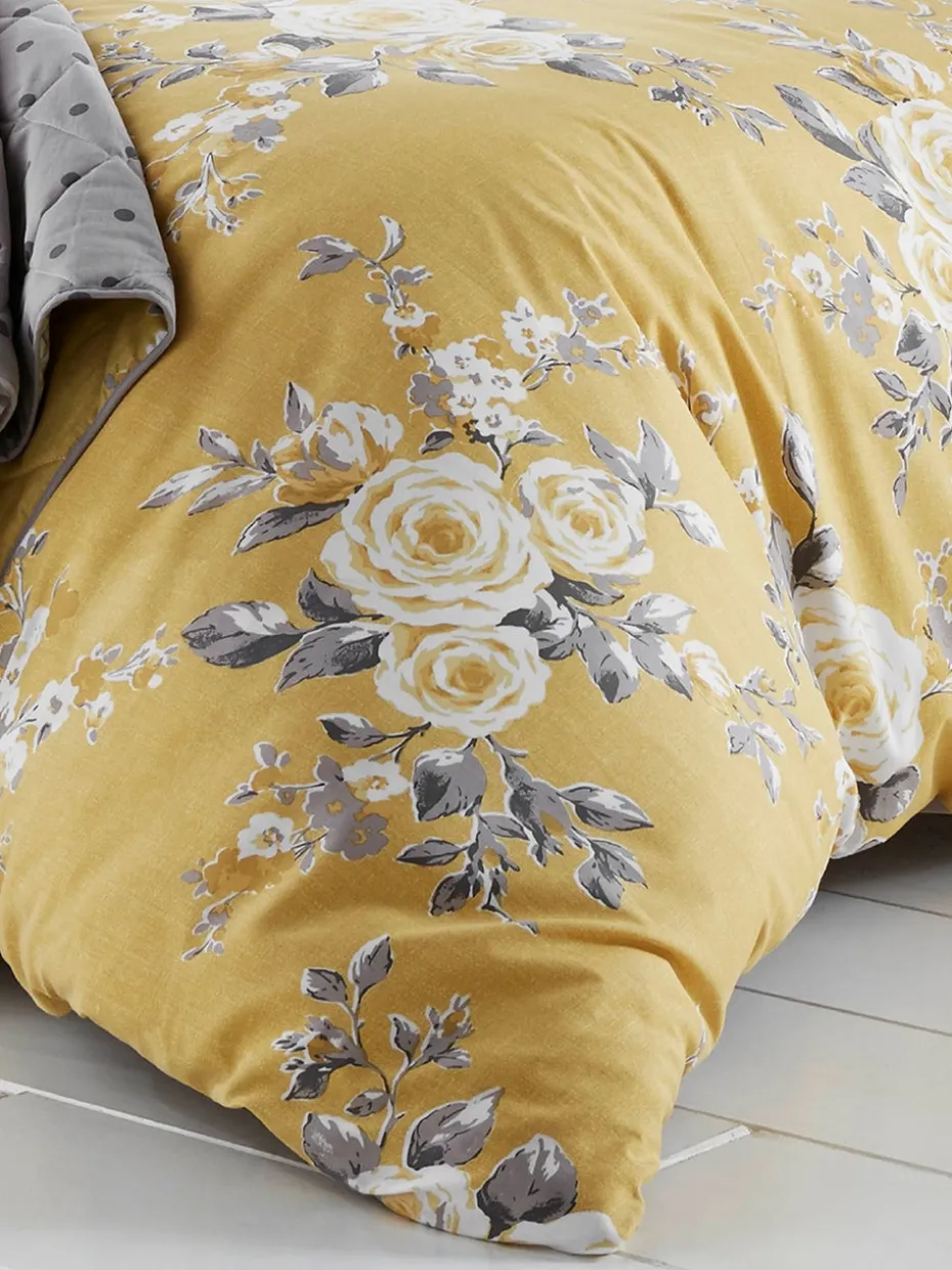 Catherine Lansfield Ochre Yellow Canterbury Floral Reversible Duvet Cover Set with Pillowcases