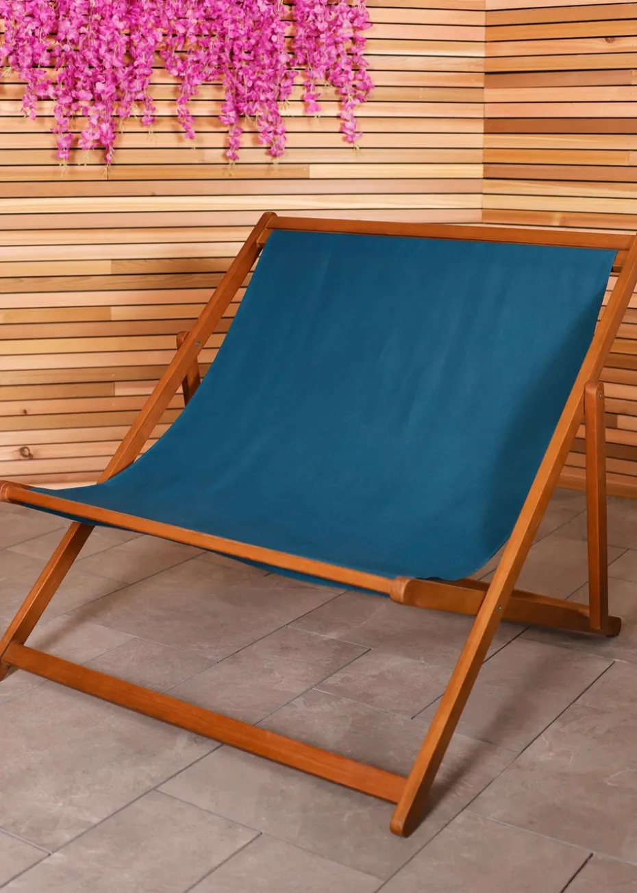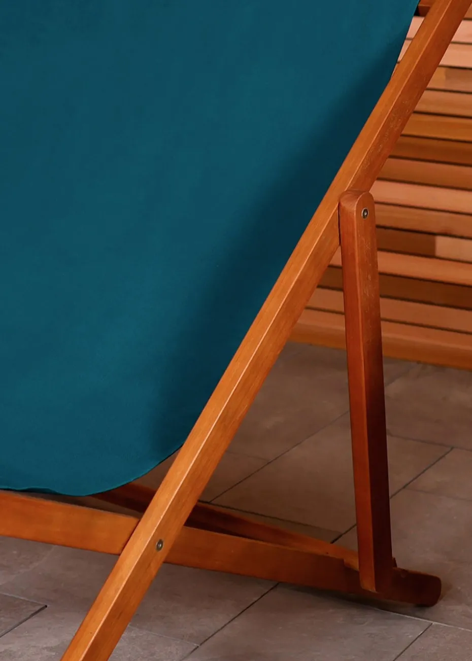Made from FSC certified Eucalyptus, this wooden double deck chair is designed to provide maximum comfort and style for you and a loved one. Durable and sustainable, the frame is covered with a fetching, high-quality polyester fabric, available in a striking teal shade. This combination of natural wood and bright material adds a vibrant touch to your garden, making it an inviting spot to relax.