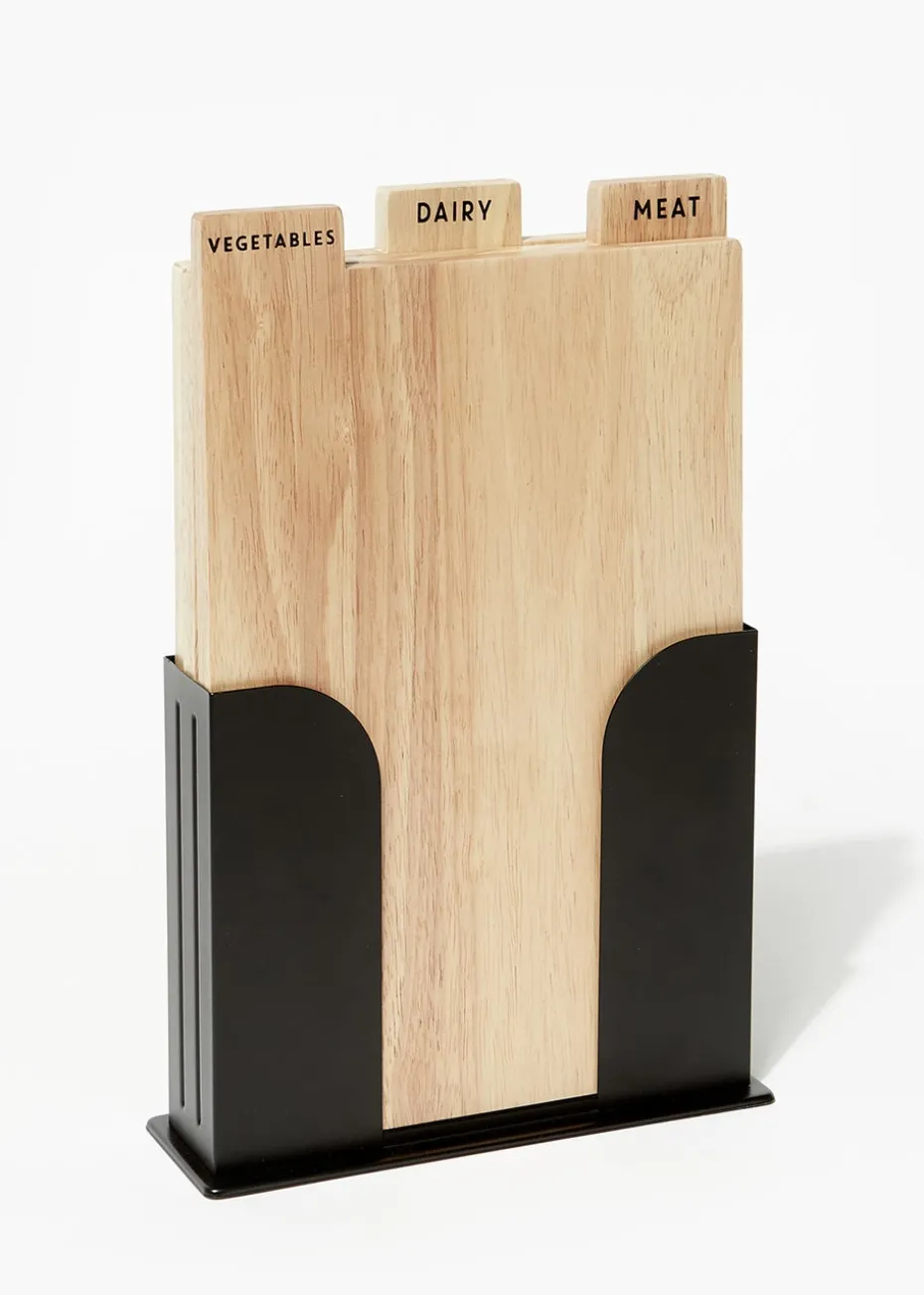 Make kitchen organisation a doddle with this stylish set of three wooden chopping boards. Each with a handy label for meat, dairy or vegetables, these boards come housed in a sleek metal holder that not only looks good but will help keep your worktops tidy too. Matching accessories are available to complete the look. Dimensions: Stand 31cm x 17cm x 6cm. Boards: 35cm x 29cm.