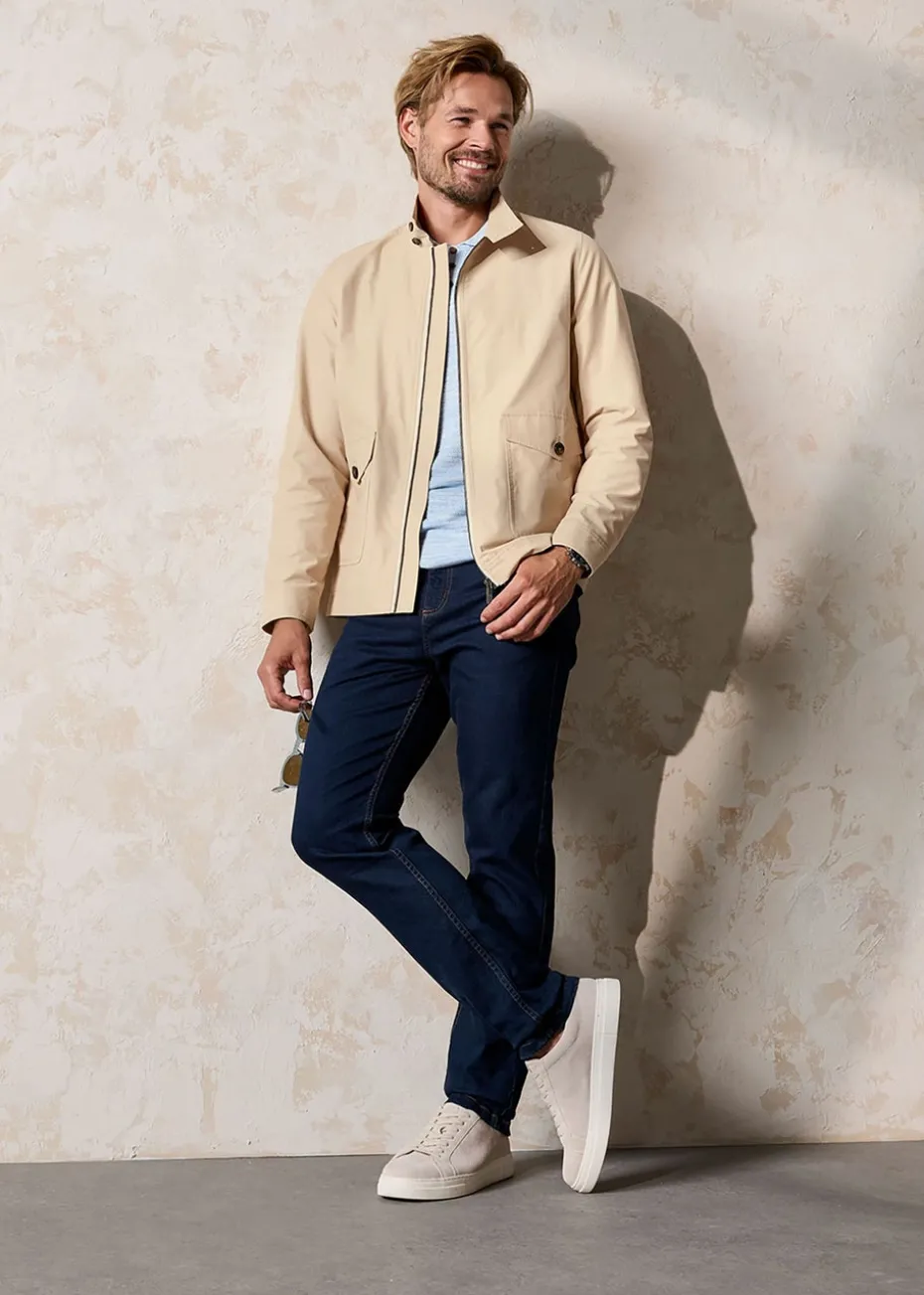 It’s the weekend and the weather can’t make its mind up. That’s where this jacket comes in. Lightweight in a classic cut and colour, this jersey-lined layer will keep you warm without weighing you down. A button fastening stand collar and two sets of pockets (plus one on the inside) make it a practical choice for all your weekend activities, while the decorative stitching throughout makes sure you’ll look smart doing them.