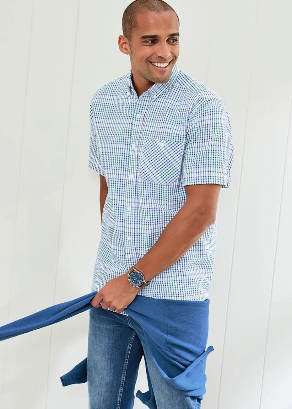 This breathable cotton seersucker shirt has a textured finish that cleverly wicks moisture away from the skin to keep you cool and comfortable on even the sunniest of days. Now updated to include fresh new checks and complete with classic short sleeve styling finished with a single chest pocket and dyed-to-match branded buttons, you’ll never lose your cool again.