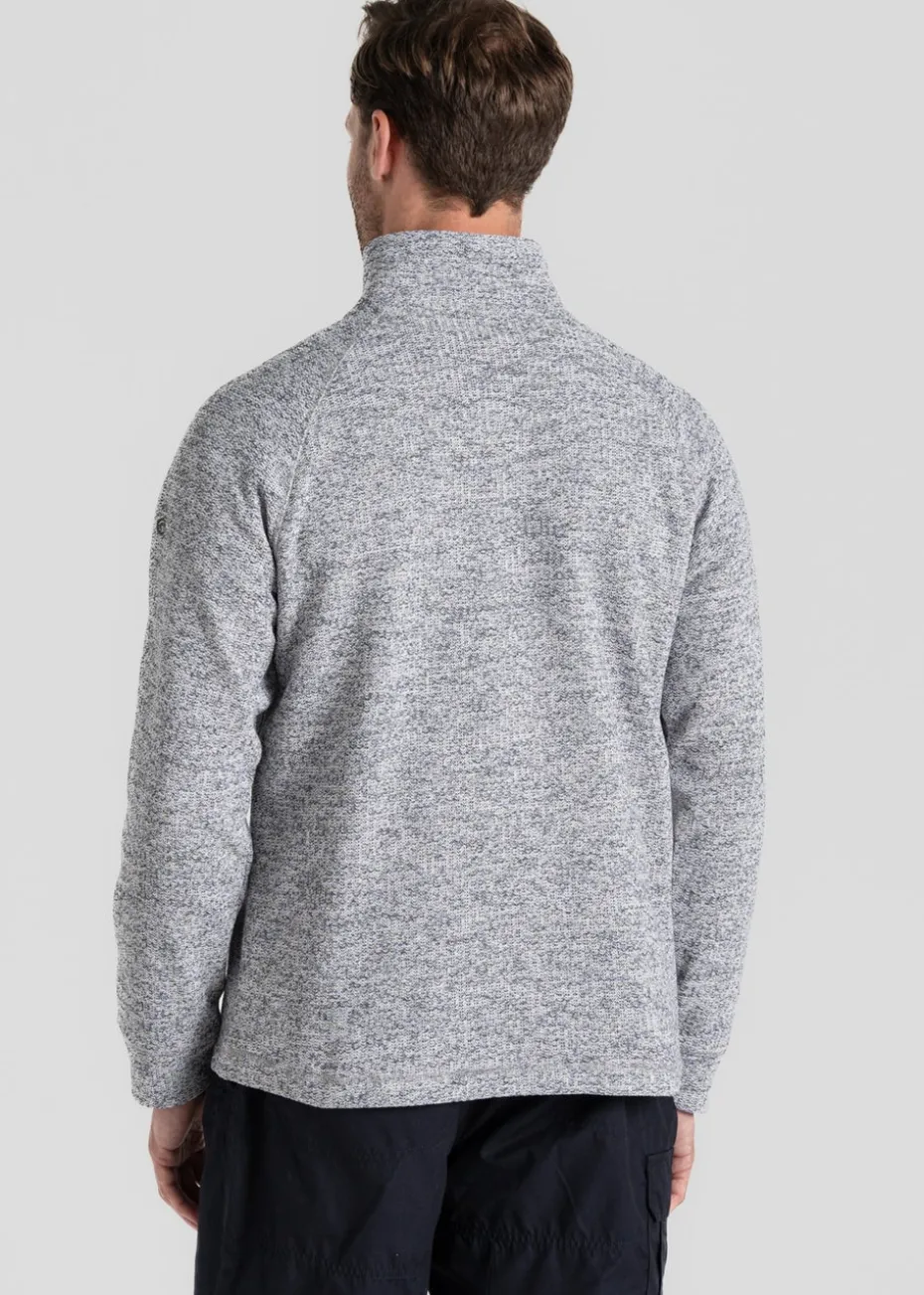 Fleece top from Craghoppers. ‘Bonan Half Zip’ is an impressive performer. The knit-look fleece fabric has the texture of a traditional winter woollen but is soft, insulating and easy-care. Available in marled grey and striped options.