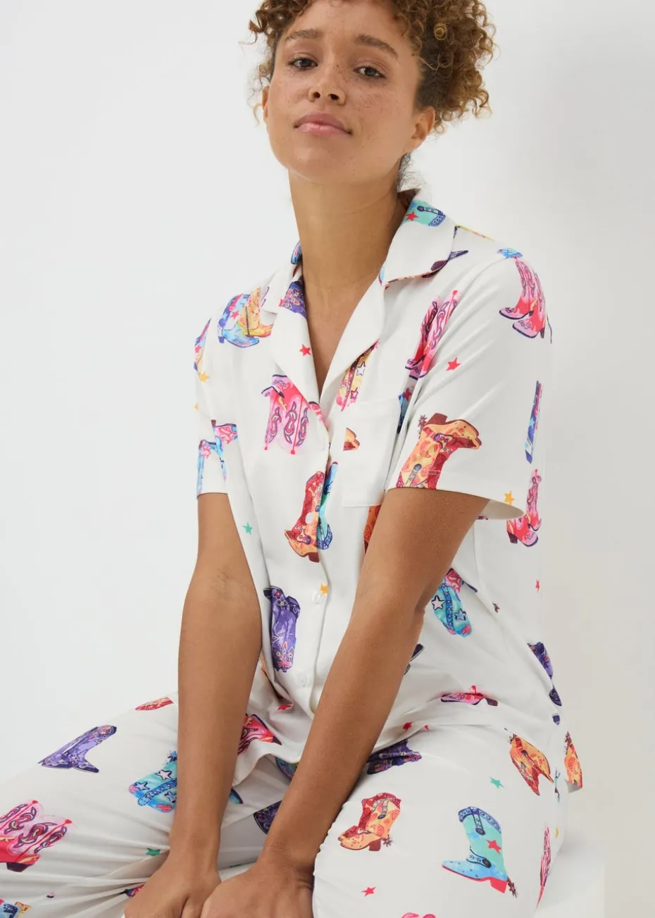 Drift off in western-inspired style with our Cream Cowboy Boot Pyjama Set. This playful two-piece features a soft cream base adorned with an all-over cowboy boot print, adding a fun twist to your nightwear collection. Made from soft, breathable fabric with a relaxed fit, it’s perfect for cosy nights and lazy mornings.