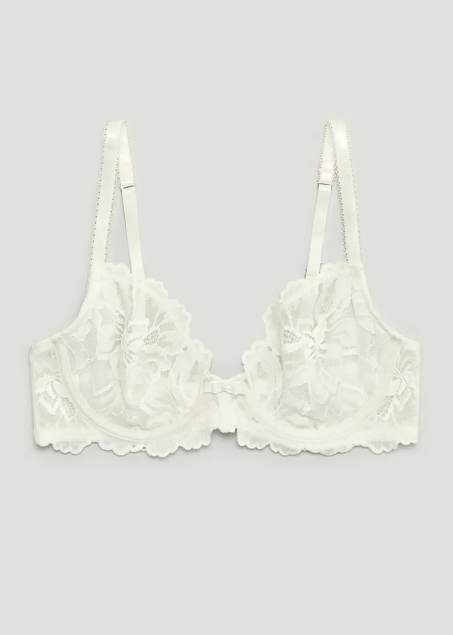 Add a demure piece to your underwear drawer with this gorgeous bra, styled in cream with gorgeous lace effect floral detailing that you’re sure to love. In a non-padded design for easy breezy comfort, other key features include adjustable straps to allow you to customise the fit, as well as a delicate bow to the centre and practical hook fastenings to the back. Model Height: 5ft 9.