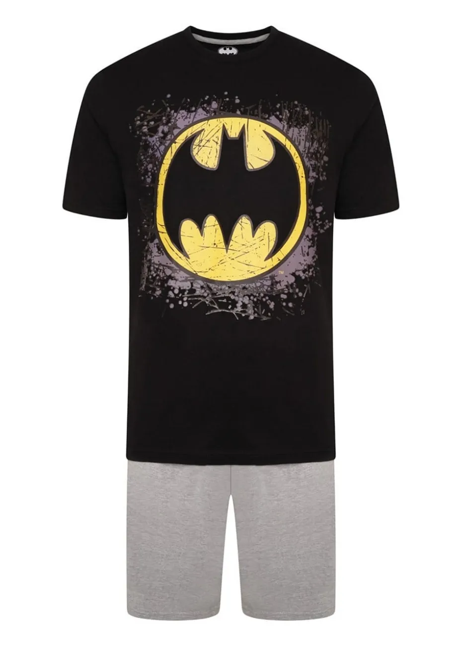 Official and sustainably made Batman mens PJs from Brand Threads’ Icons collection! Short sleeve black top with iconic Batman logo, contrasting grey marl shorts. Made with BCI cotton.