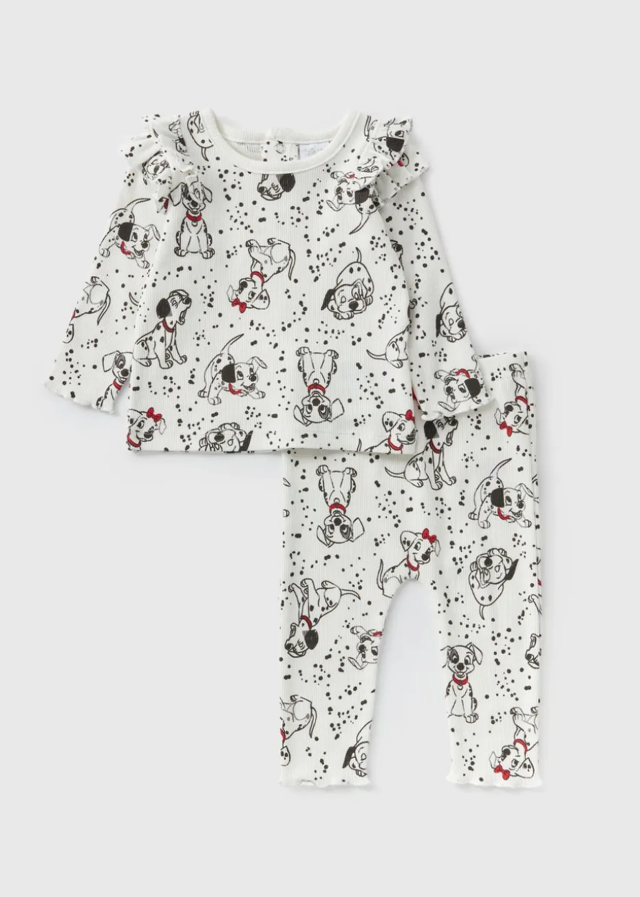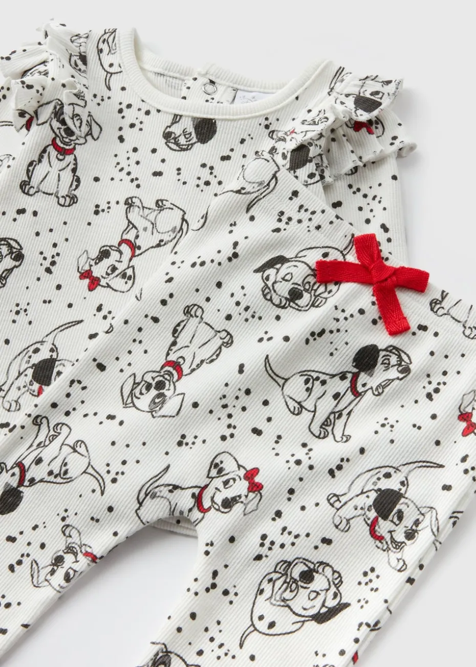 Your little one will look adorable in this Dalmatians ribbed top and leggings set! The cream-coloured set includes a long-sleeved top and matching leggings, both made from a soft and stretchy cotton rich blend fabric. The top and matching leggings feature an all-over print of the 101 Dalmatian puppies, while the leggings also feature a red bow detail. This set is perfect for everyday wear or for special occasions.