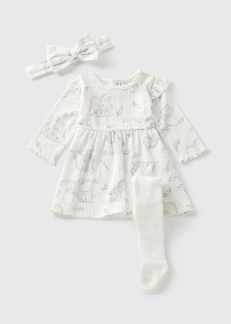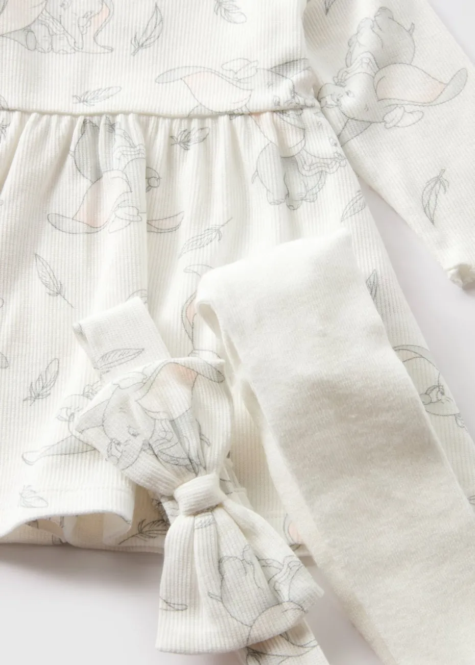 Your little one will be flying high with our Disney Baby Cream Dumbo Dress Set. Perfect for any occasion, this adorable outfit features a vibrant Dumbo print on a soft and cozy cotton-blend dress. The matching tights and headband complete the look and will keep your little one comfy all day long. Plus, the included headband cream will keep them warm.