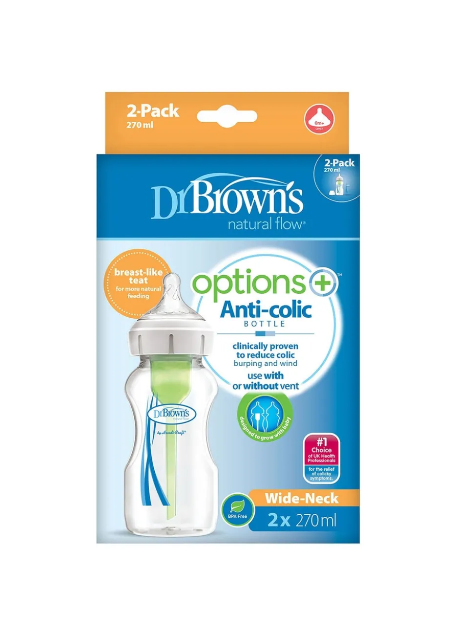 Dr Browns Options+ Anti-Colic 270ml Twin Pack. The enhanced design of the Dr Brown’s Options+ Anti-Colic Bottle is clinically proven to reduce windy colic due to Dr Brown’s unique 100% vacuum-free vent system. Dr Brown’s Options+ bottles offer an easy and comfortable way to feed your little-one, adapting to their needs as they grow. With the unique design, this bottle can be used with or without the removable internal vent system, transforming it into a teat-vented bottle for more convenience. Use Dr Brown’s Options+ bottles from birth. Don’t wait until your baby develops colic! The unique internal green vent system continues to create 100% vacuum free feeding, which is clinically proven to help reduce wind related colic. This is what makes Dr Brown’s the number one choice of UK Health Professionals for the relief of colicky symptoms. The breast-like teat shape is correctly contoured for a proper latch and a more natural bottle-feeding experience – perfect for switching from breast to bottle and back again! Each teat is specially engineered to offer the same consistent natural flow, so you and baby know what to expect in every feed.
