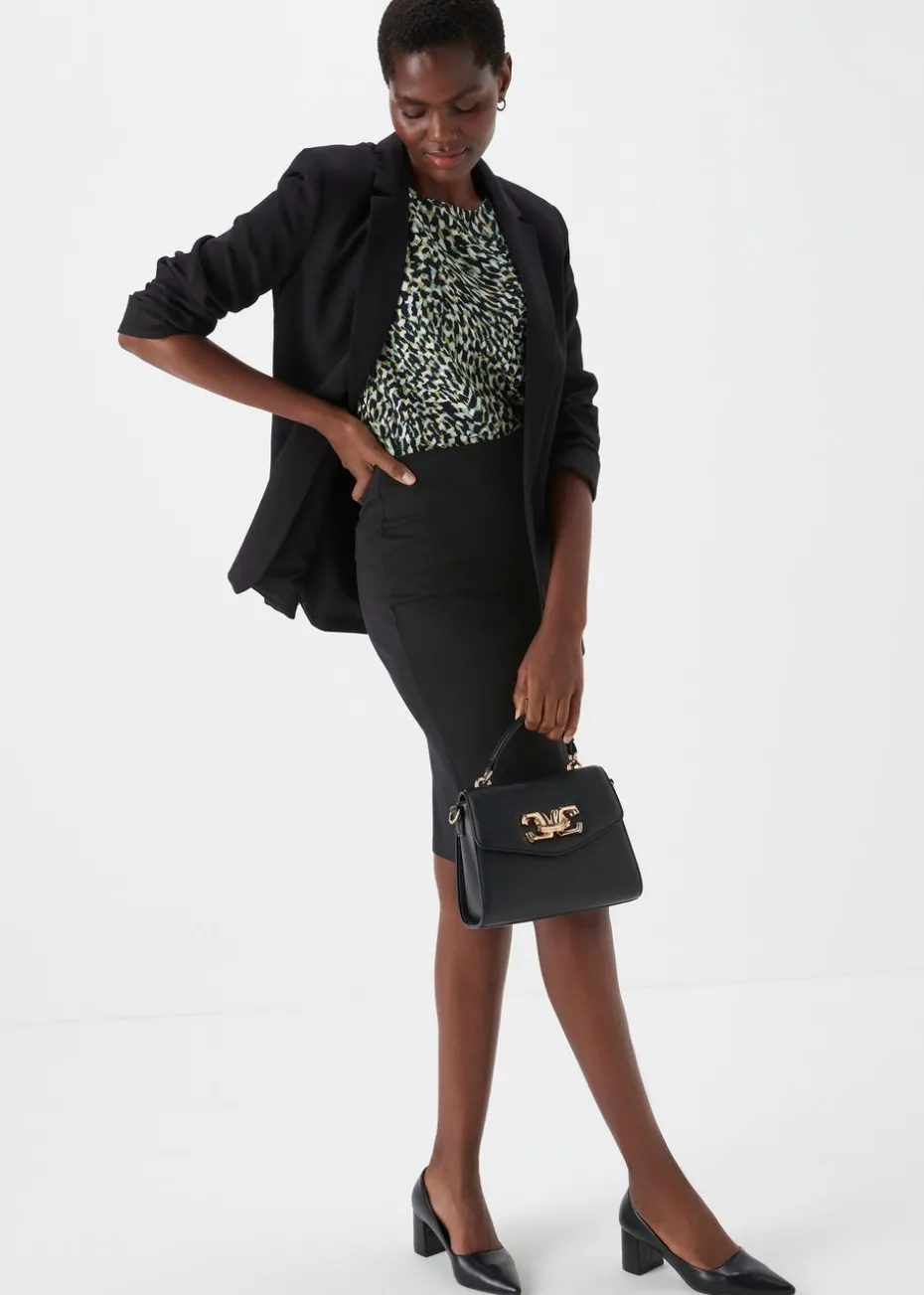Timeless, flattering, and endlessly versatile, the Black Ponte Knee Length Skirt is a wardrobe essential every woman needs. Made from a structured yet stretchy ponte fabric, it hugs in all the right places while keeping you comfortable from day to night. Dress it up with a crisp white shirt, a pair of ankle boots, and a statement necklace for a sophisticated office look.