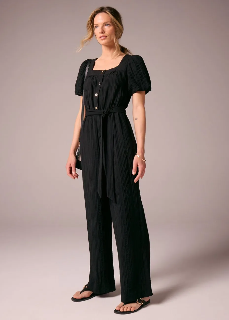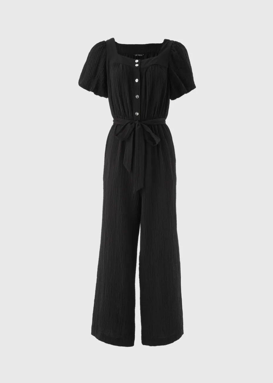 Step into effortless sophistication with our Et Vous Black Textured Tie Belt Jumpsuit. Designed for the modern woman, this one-piece wonder features a chic textured fabric that adds depth and dimension to a classic silhouette. Enhanced with a flattering tie belt that cinches the waist, creating a sleek, feminine shape. With its short sleeves, tapered legs, and clean neckline, this jumpsuit transitions seamlessly from desk to dinner and everywhere in between.