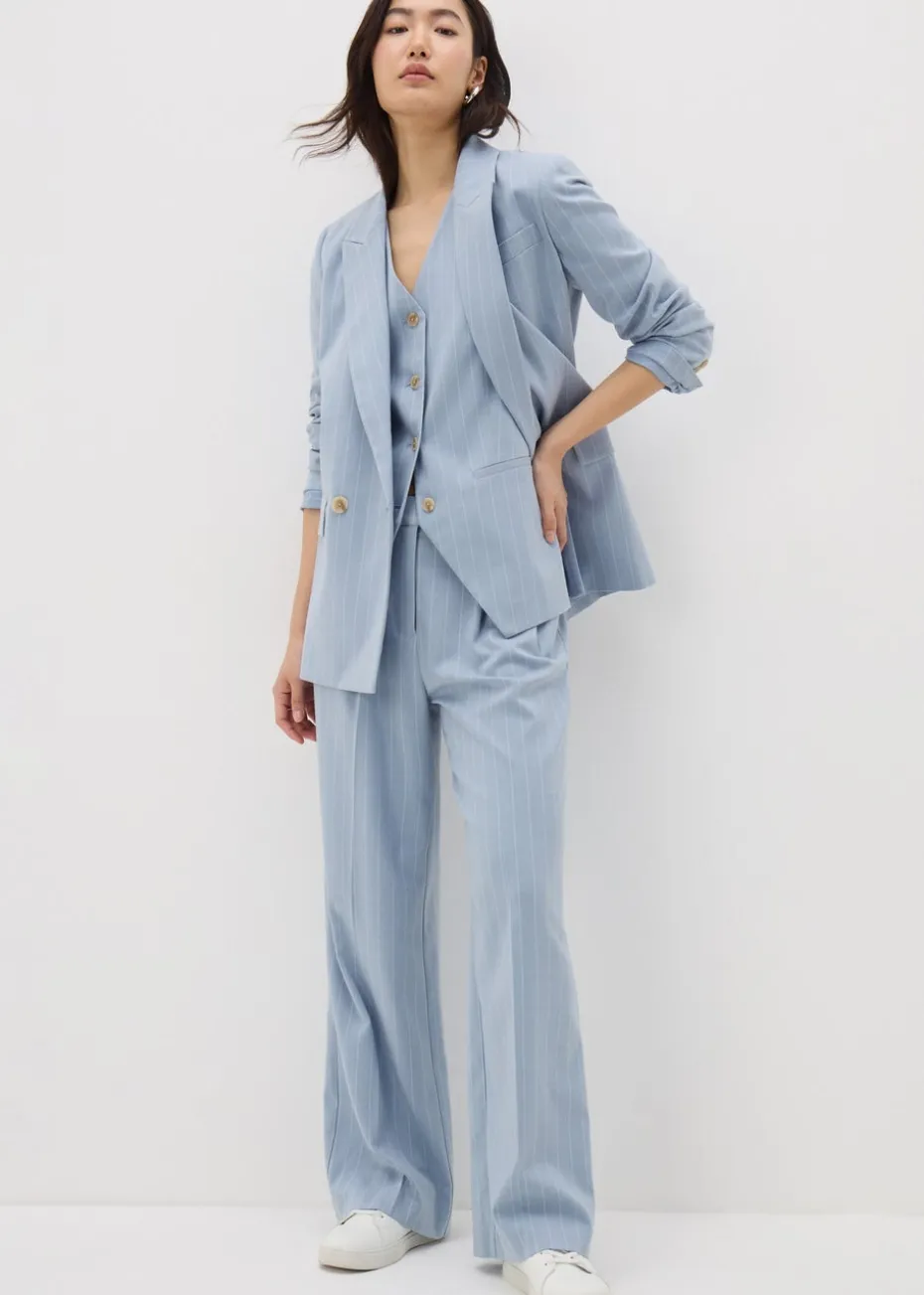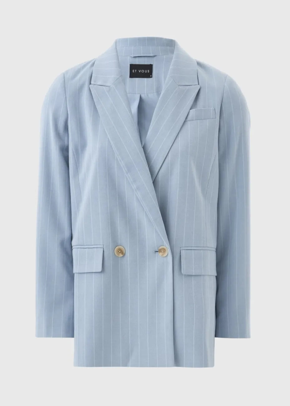 A dash of classic, a hint of contemporary – this Et Vous Blue Pinstripe Blazer is set to steal your heart! Perfectly tailored to offer you a flattering fit, this piece oozes sophistication with its sharp pin stripes. Crafted to a double breasted fit, long sleeve and a notched lapel.