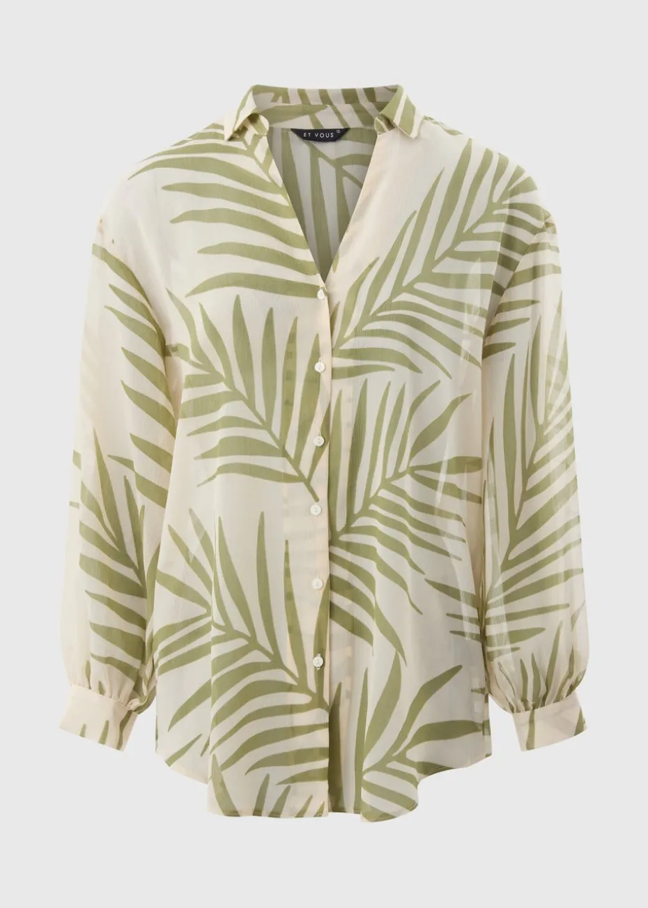Add a tropical touch to your wardrobe with the Et Vous Green Palm Leaf Blouse. Featuring a vibrant palm leaf print, this blouse offers a relaxed fit and lightweight fabric, perfect for warmer days. The fresh green tones and stylish design make it a versatile piece for casual outings or beach-inspired looks. Pair it with jeans or skirts for an effortlessly chic style.
