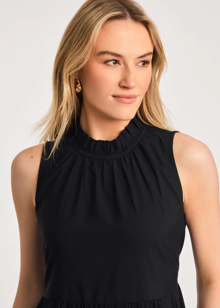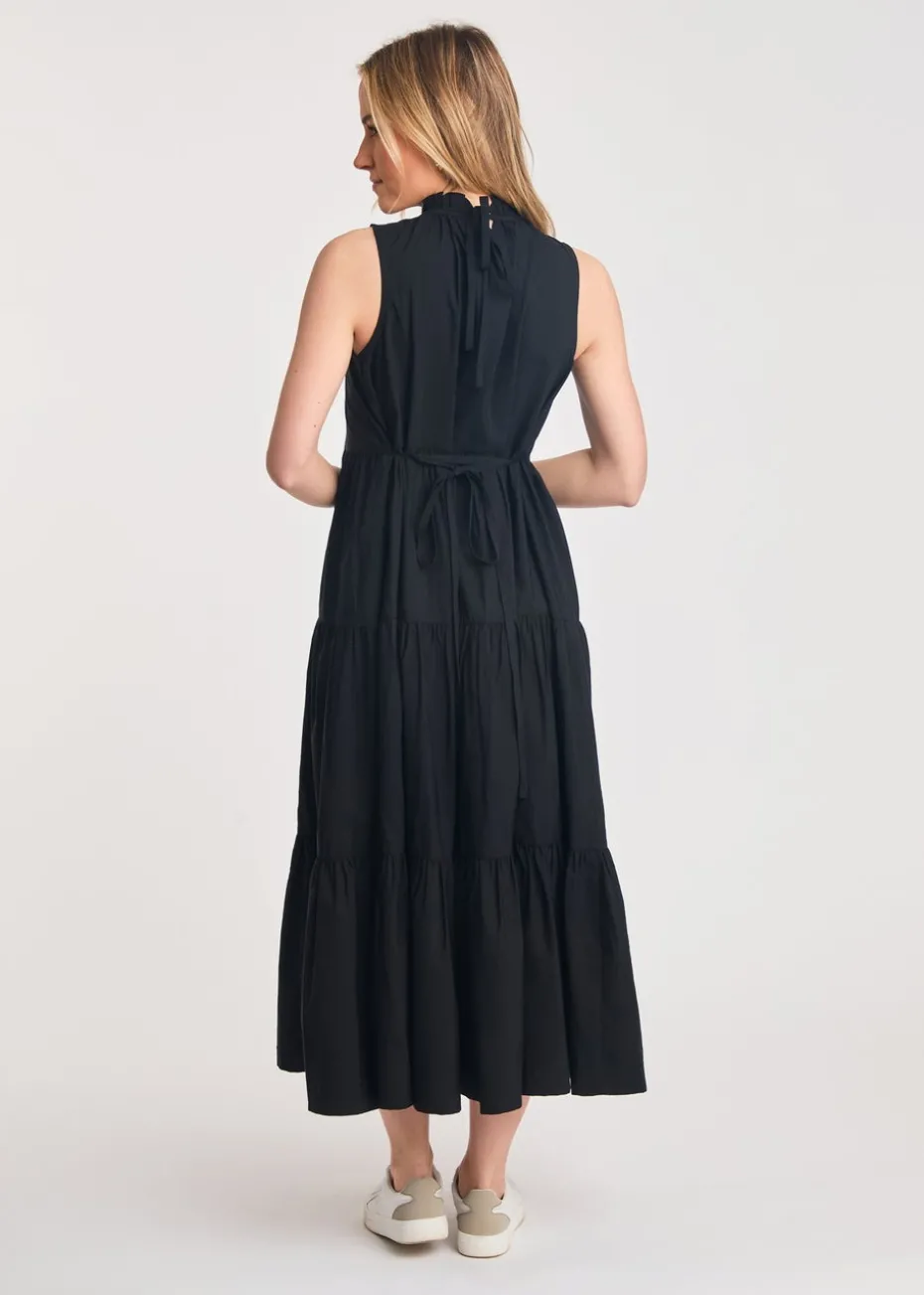 French Connection Black Cotton Blend Sleeveless Poplin Tiered Midi Dress