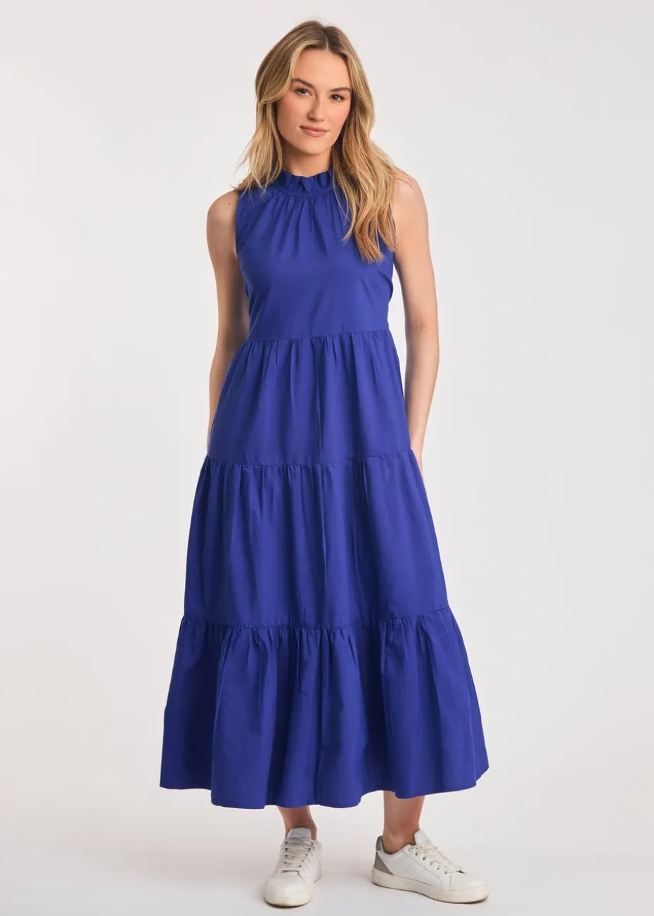 French Connection Blue Cotton Blend Sleeveless Poplin Tiered Midi Dress