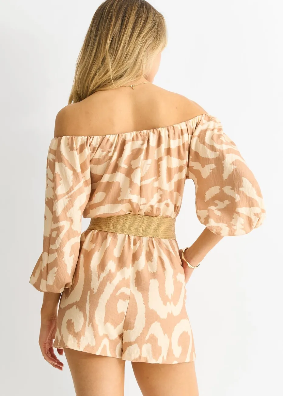 Gini London Beige Abstract Belted Bardot Viscose Playsuit