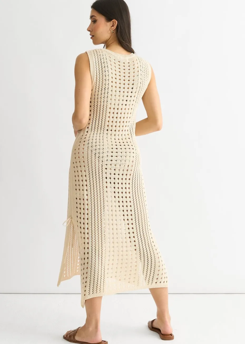 Gini London Beige Crochet Knit Bodycon Midi Dress