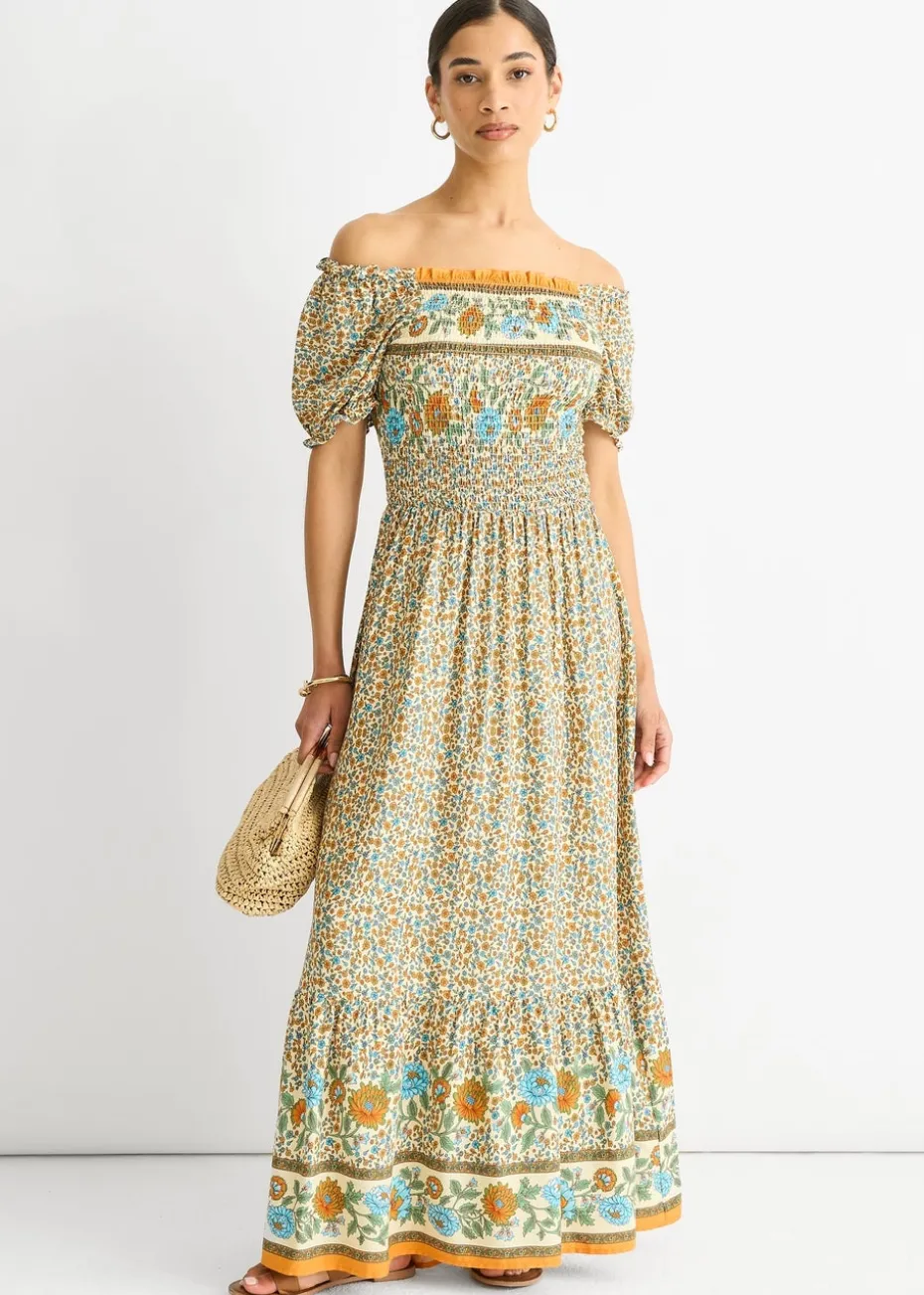 Gini London Beige Viscose Border Print Shirred Maxi Dress