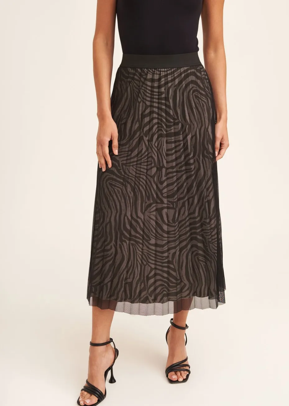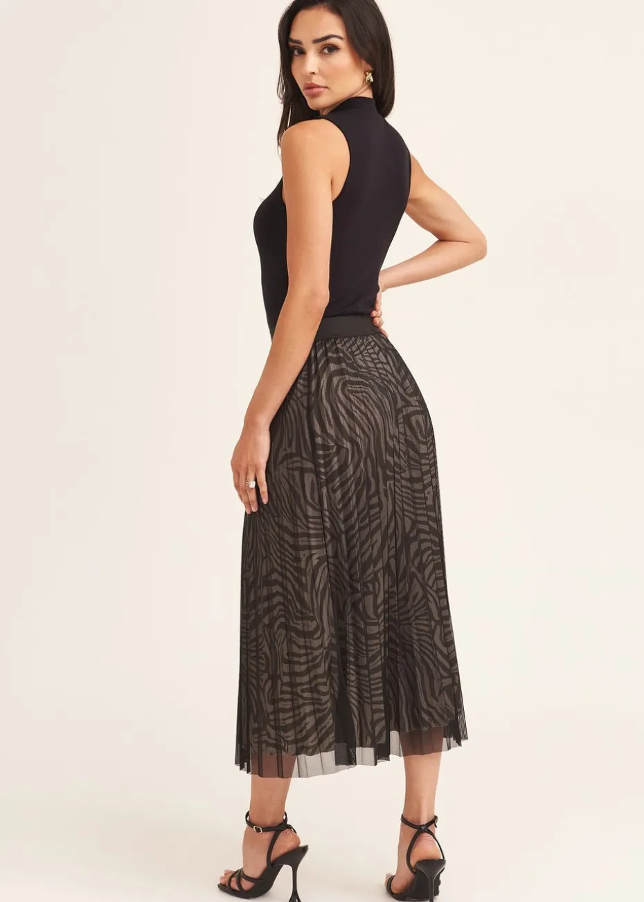 Gini London Black Animal Print Mesh Overlay Pleated Midi Skirt