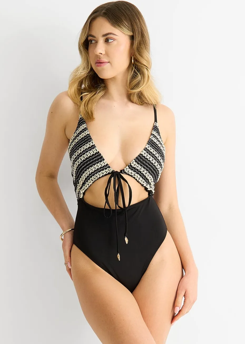 Gini London Black Crochet Textured Tie Front Cutout Swimsuit
