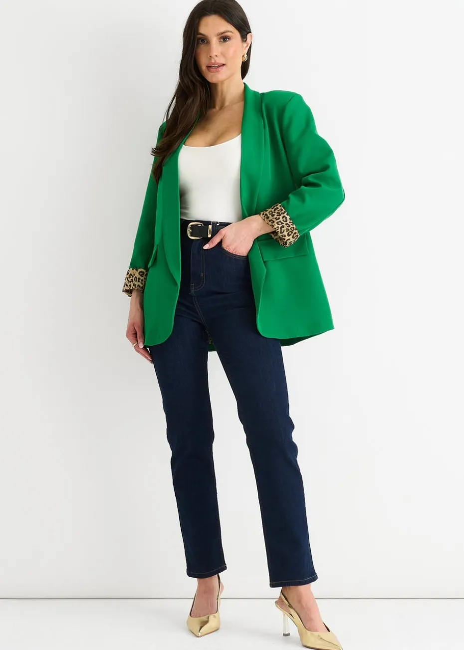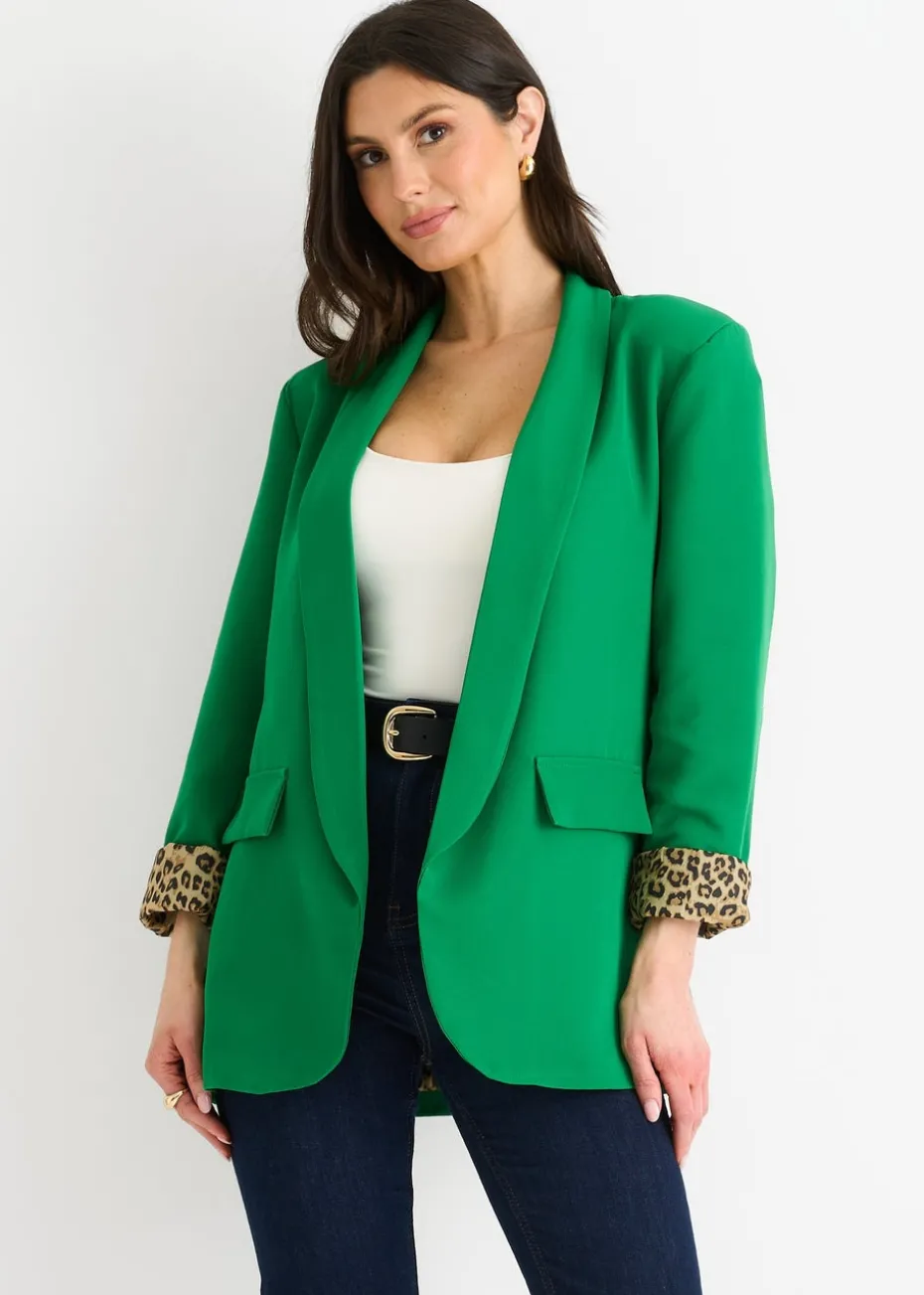 Gini London Green Contrast Animal Edge To Edge Blazer