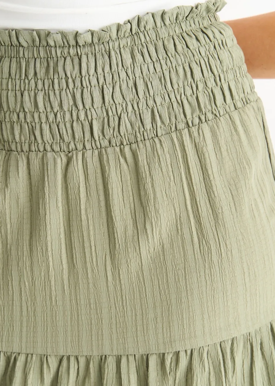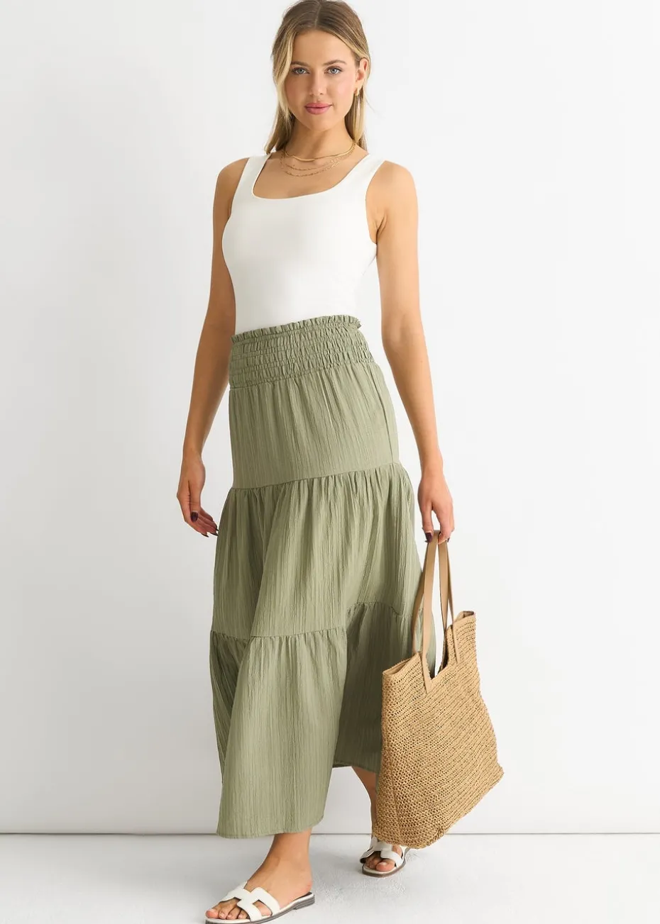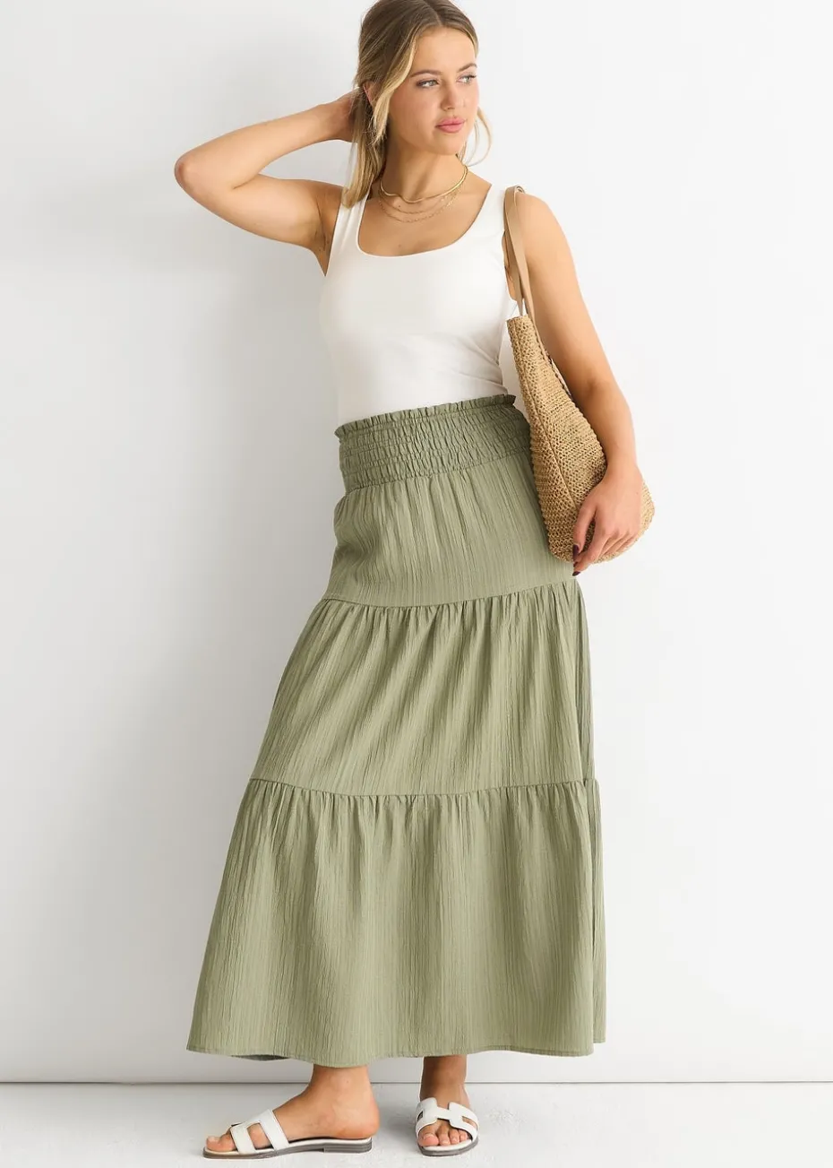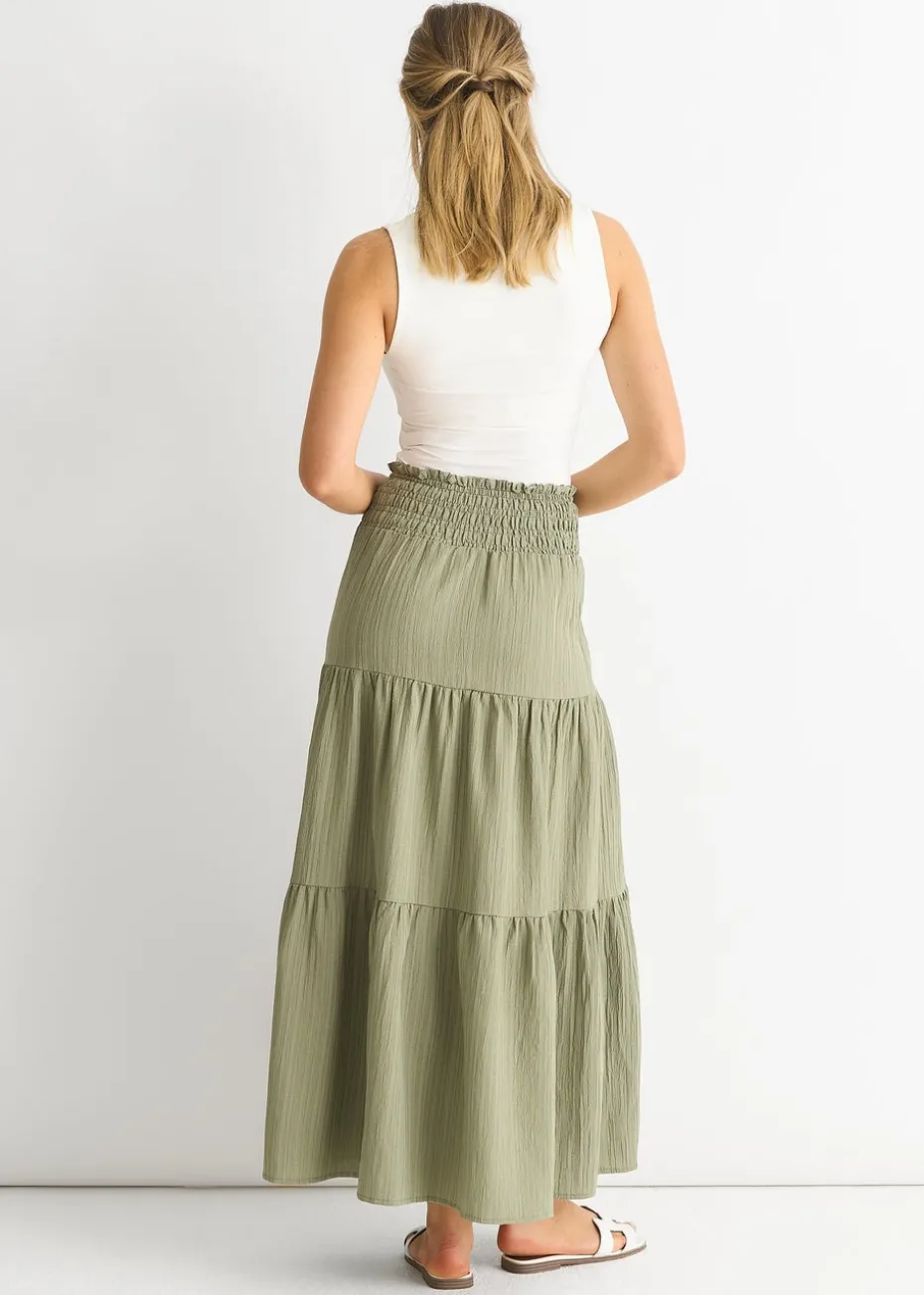 Gini London Khaki Smocked Tiered Maxi Skirt
