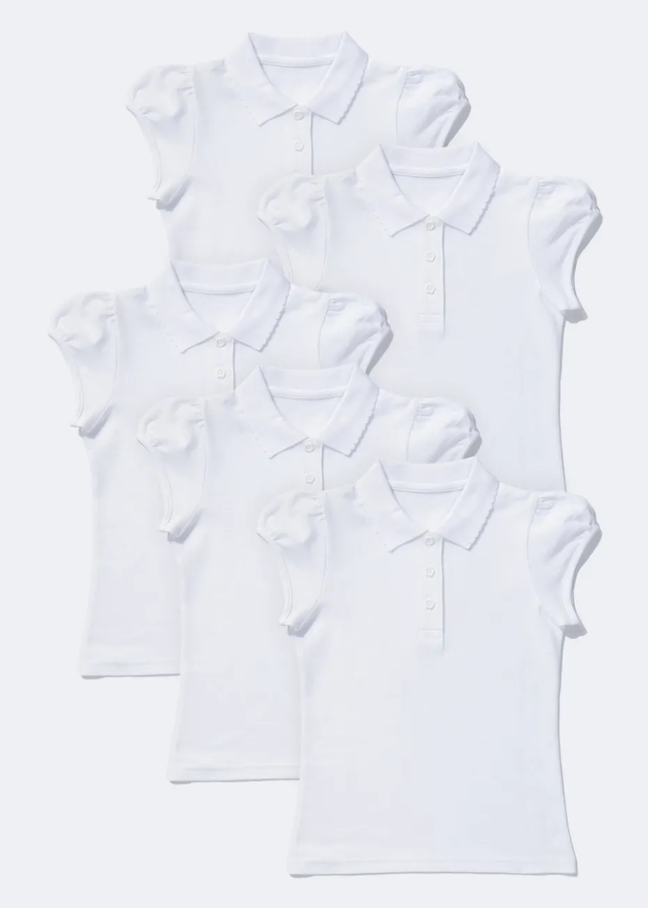 Stock up on school staples with this pack of pretty polo shirts. Made from soft and comfortable 100% cotton, these shirts have puffed cap sleeves, a scalloped collar and a classic three button placket to make them the perfect fit for school wear.