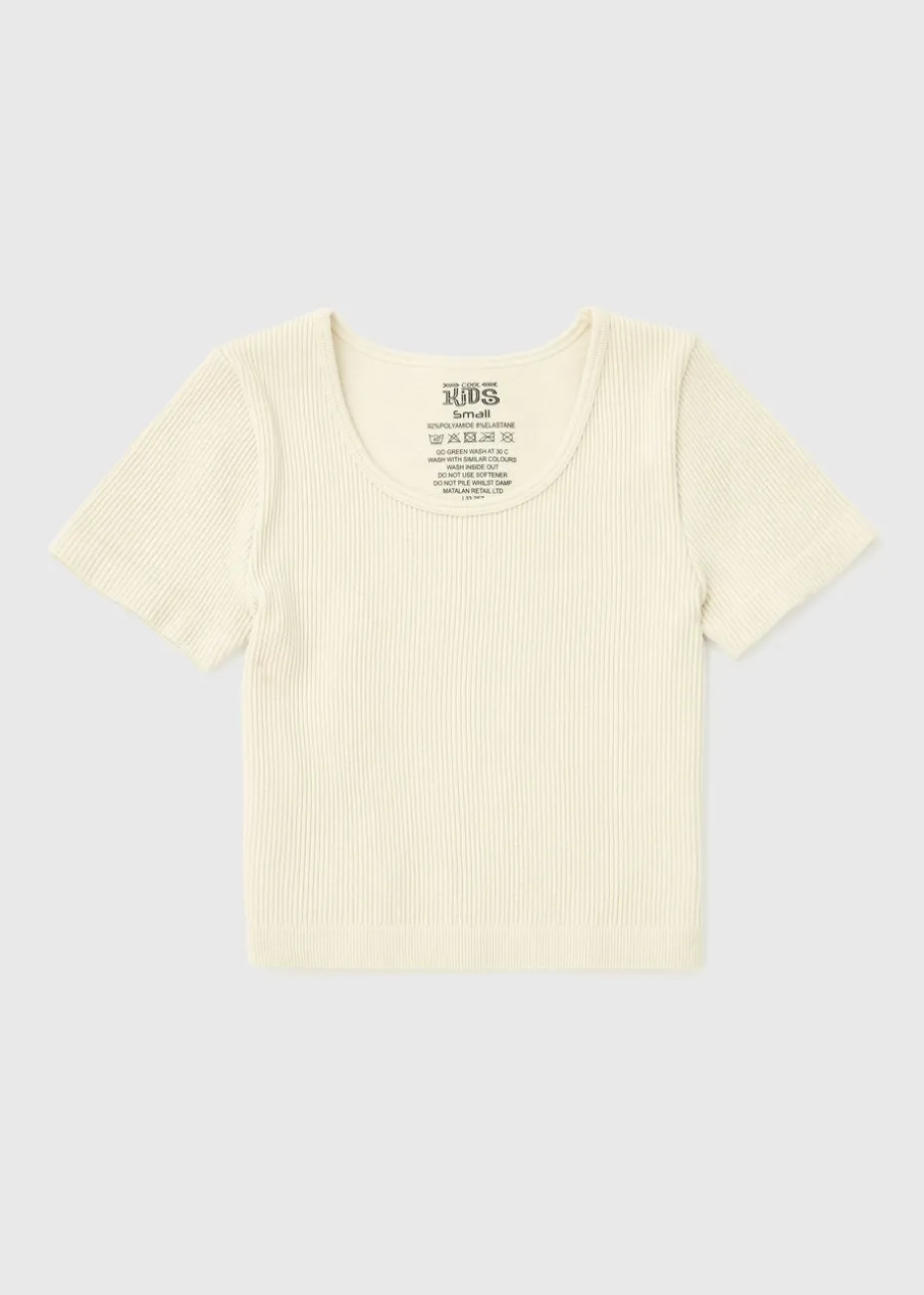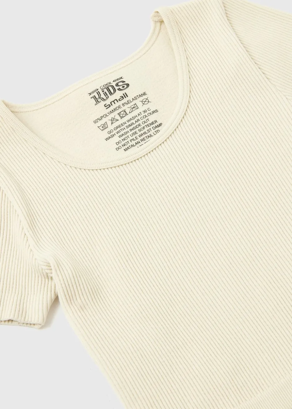 Your little one will look and feel their best in our cream seamless top. This top is designed for all-day comfort with a ribbed material and short sleeves for a cool and comfortable fit. With its seamless construction, this top is perfect for layering or wearing on its own. The classic cream colour is versatile and can be paired with a variety of bottoms for endless outfit possibilities. Pair with the matching leggings and trainers for a casual look or pair with a skirt and ballet shoes for a nice dressed up look.