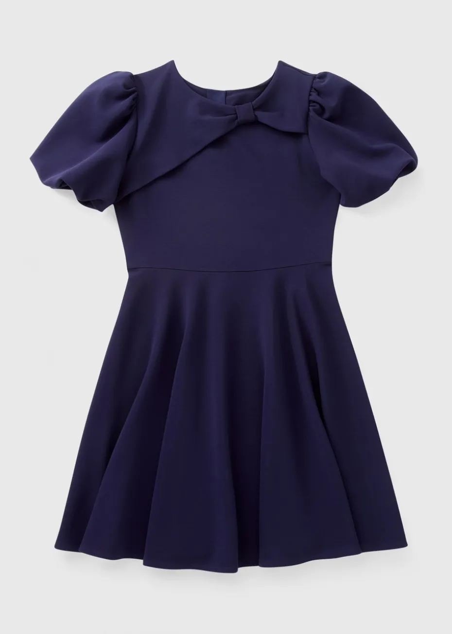 Elegant and charming, this Girls Navy Bow Scuba Dress is perfect for parties, special occasions, or simply dressing up in style. Crafted from soft scuba fabric for a structured yet comfortable fit, the dress features a short sleeve design with a classic round neckline and a statement bow detail at the waist for an extra touch of sweetness.