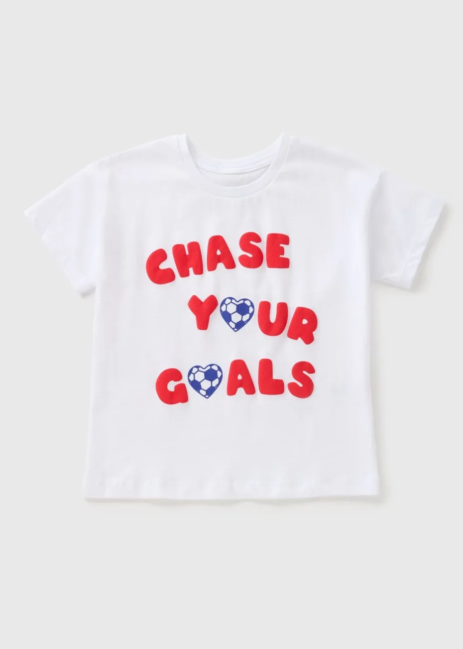 Inspire her to dream big and move boldly with this Girls White Chase Your Goals T-Shirt. Featuring a motivational “Chase Your Goals” slogan in stylish lettering, this tee is perfect for confident, goal-getting girls. Crafted from soft, breathable cotton with a classic fit, it’s ideal for everyday wear, whether she’s heading to school, hanging out with friends, or relaxing at home.