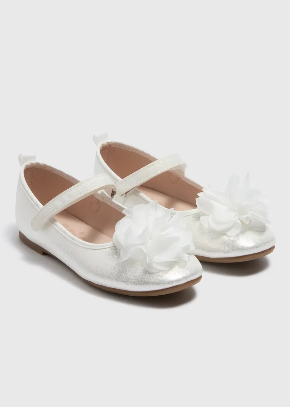 These Girls White Corsage Ballet Shoes add a touch of sparkle and elegance to any outfit. Featuring a classic ballet flat design, they are made with soft, flexible materials for all-day comfort. The white finish gives them a stylish and eye-catching look, perfect for both casual wear and special occasions.