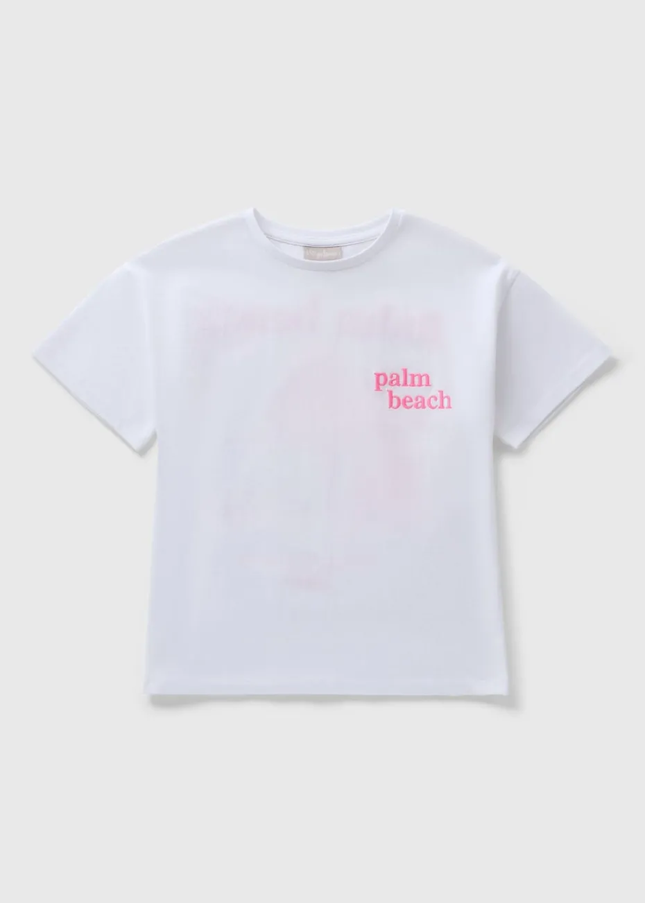 Our Girls White Palm Beach T-Shirt brings a taste of tropical paradise to your little one’s wardrobe. Crafted from soft, high-quality cotton, this tee promises all-day comfort for your precious girl. The vibrant white hue exudes a crisp, clean look, making it a versatile staple in her collection.