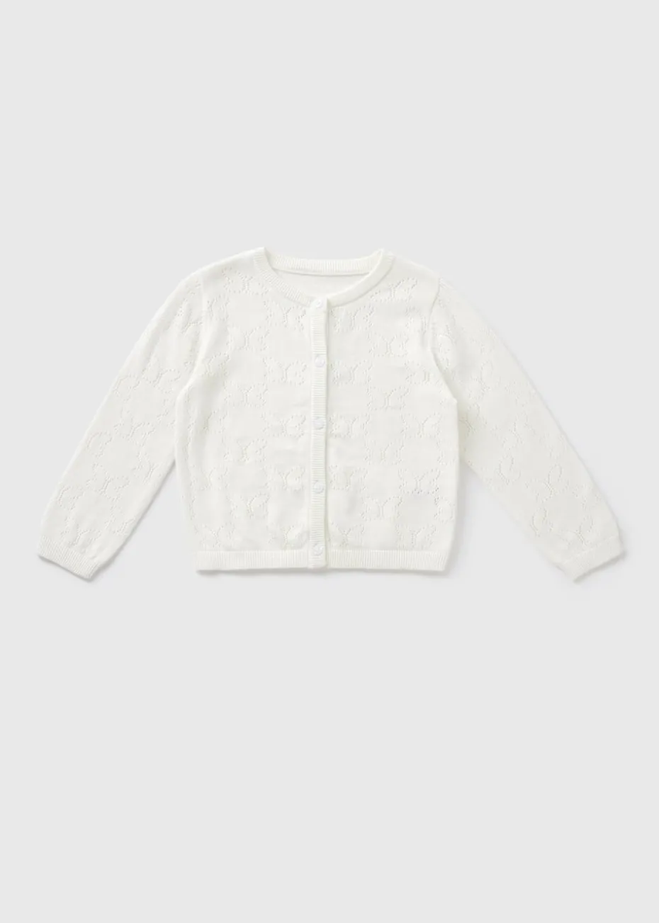 Our delightful Girls White Pointelle Cardigan in a crisp white hue is the perfect layering piece for your little girl’s wardrobe. Crafted from a soft and snuggly fabric, this cardigan will keep her cosy and comfortable all day long. The delicate pointelle detailing adds a touch of charm, making it a stylish addition to any outfit. Layer over a simple dress for a casual yet stylish look.