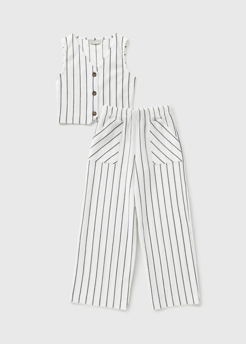 Featuring a sleeveless woven pinafore co-ord with two patch pockets and a button-down waistcoat over top for a trendy textured look. In a versatile mono colourway, she’ll wear this set on repeat.