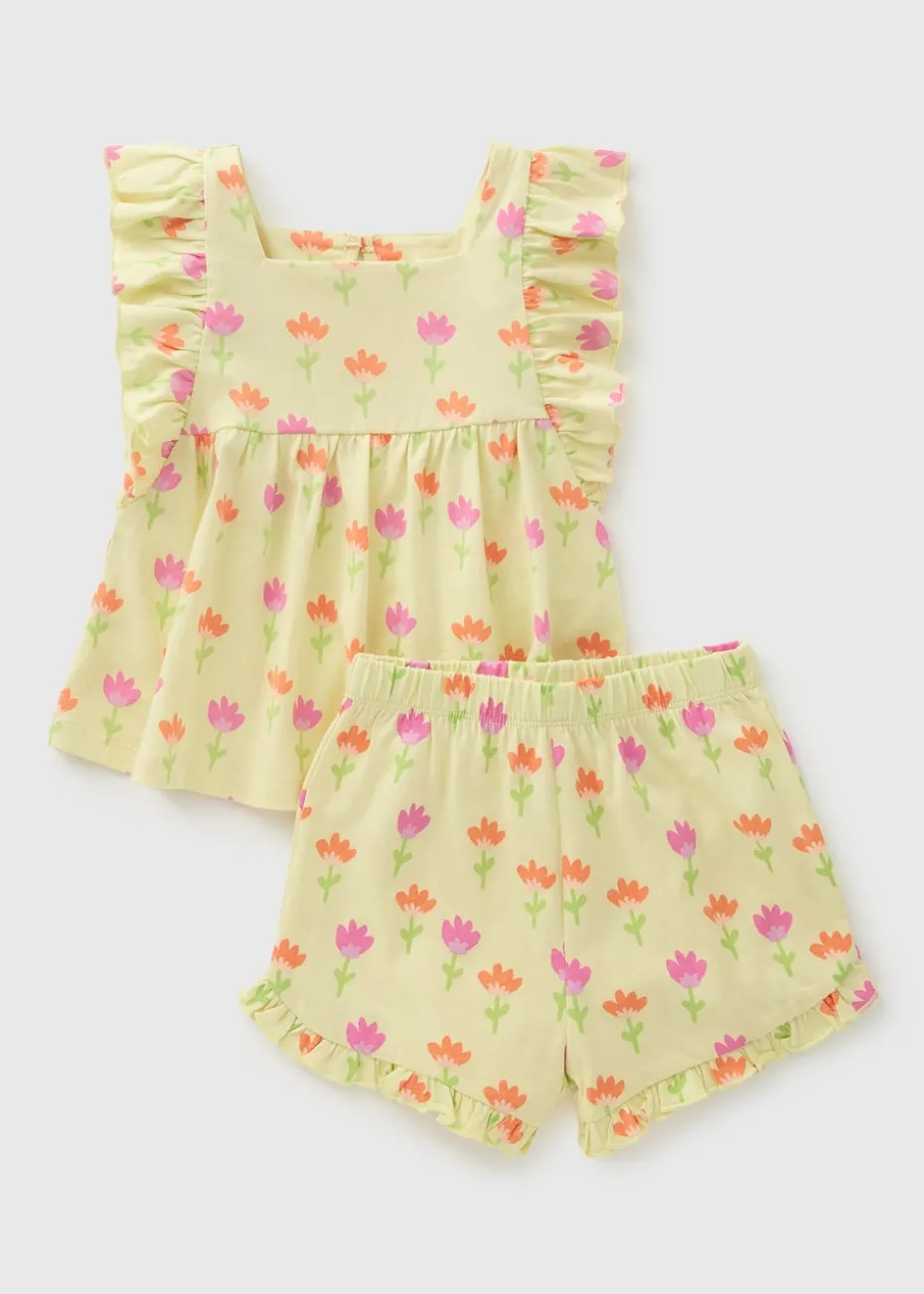 Sunshine style starts here! This Girls Yellow Flower Frill Top & Shorts Set is perfect for warm days and playful adventures. The bright yellow top features delicate frill detailing and a pretty all-over floral print, while the matching shorts keep things comfy with an easy pull-on design. Whether she’s out with friends or on a family getaway, this set brings breezy charm and all-day comfort.