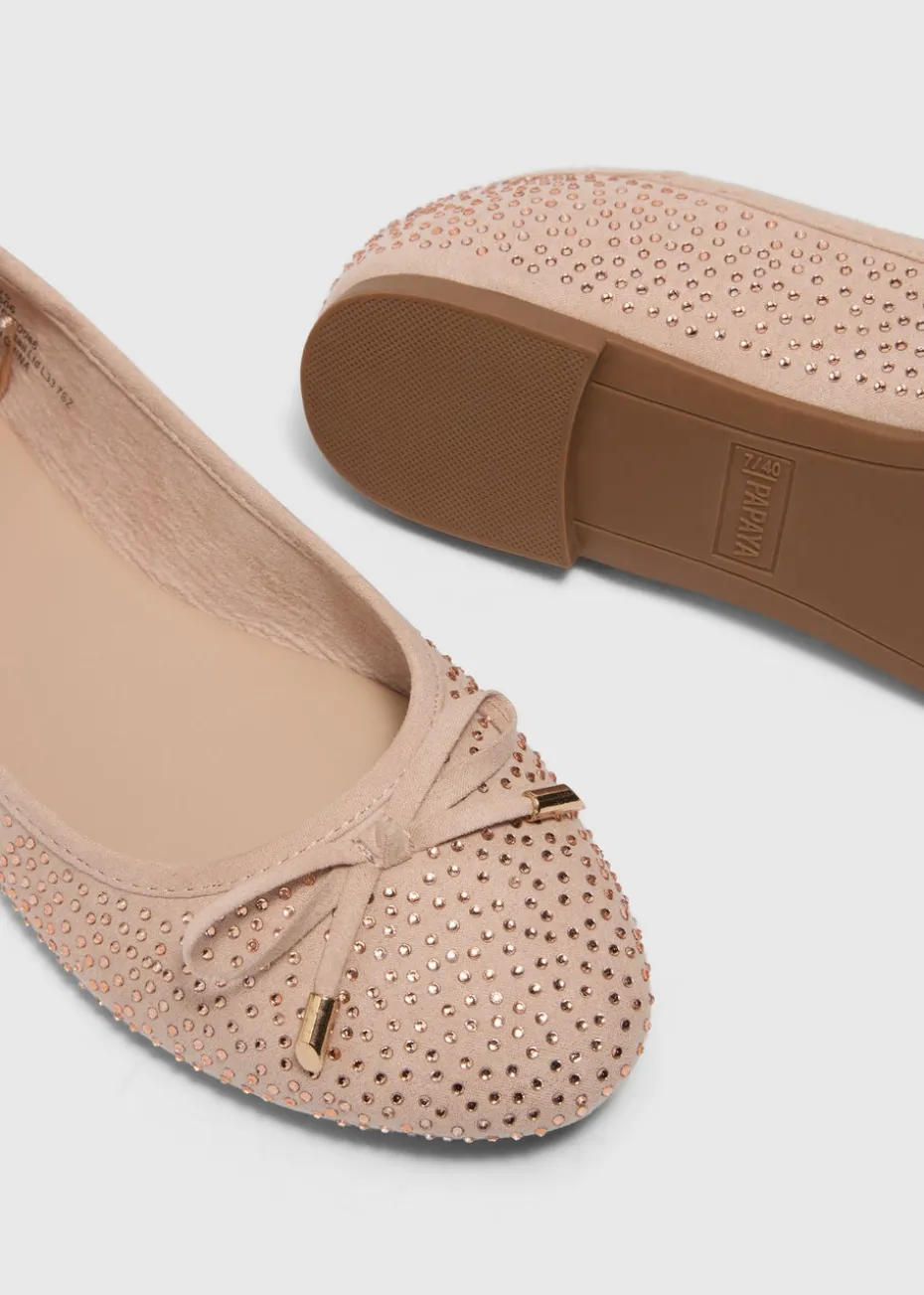 Step into elegance with our Gold Diamante Ballet Flats. These chic and comfortable shoes feature a stunning gold finish, adorned with a delicate scattering of sparkling diamantes for a touch of glamour. Perfect for both casual and dressy occasions, the ballet flats offer a soft, cushioned insole that ensures all-day comfort without compromising style.