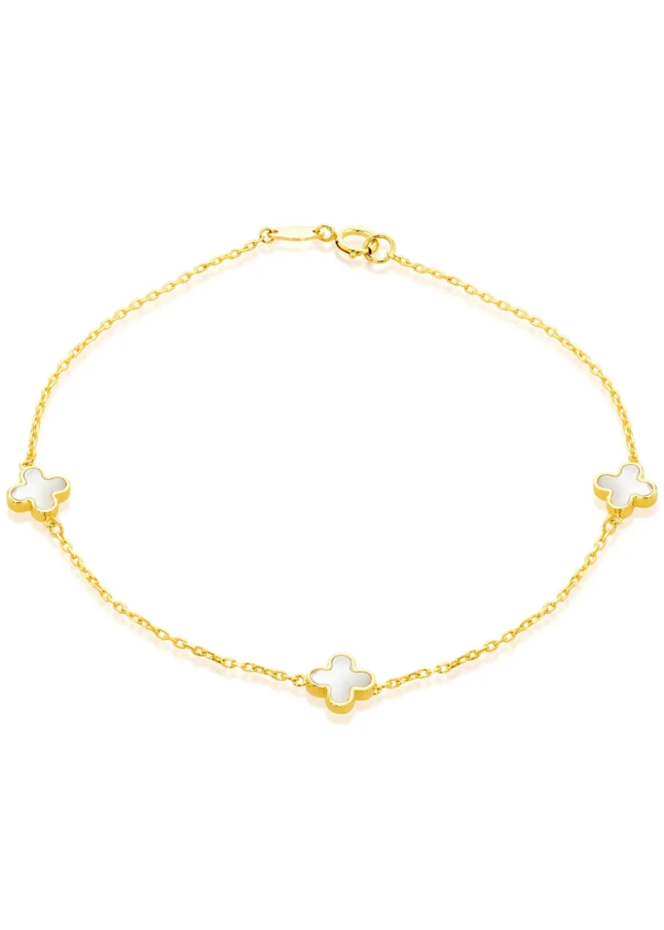 This 9ct Yellow Gold 3 x 6.5mm Mother of Pearls Clover Petals Bracelet is a delicate and elegant piece.