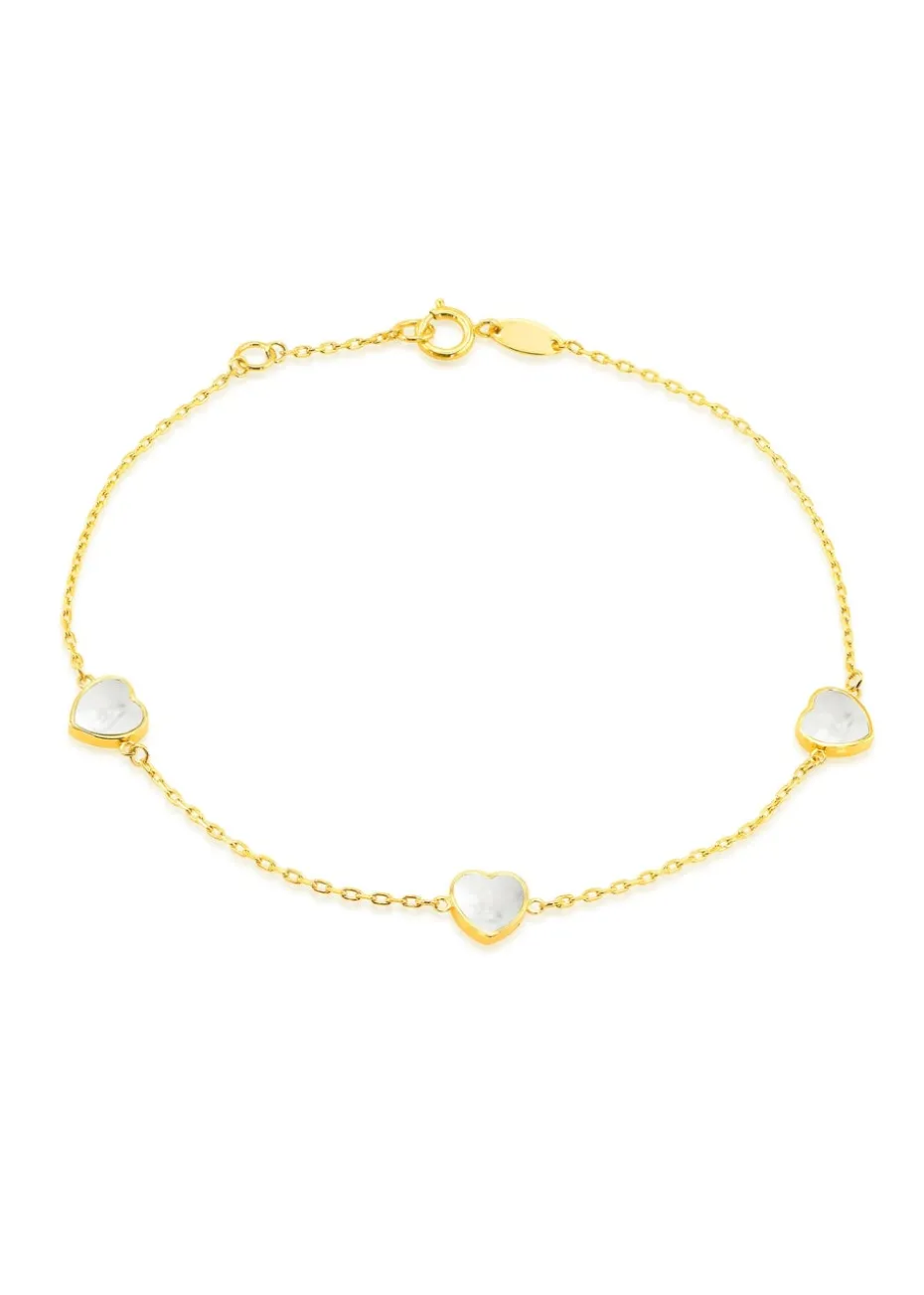 This 9ct yellow gold bracelet features a delicate design with three 6mm Mother of Pearl heartshaped petals.