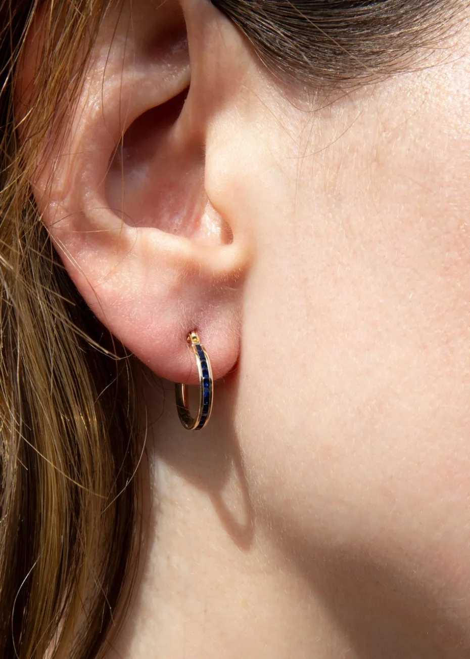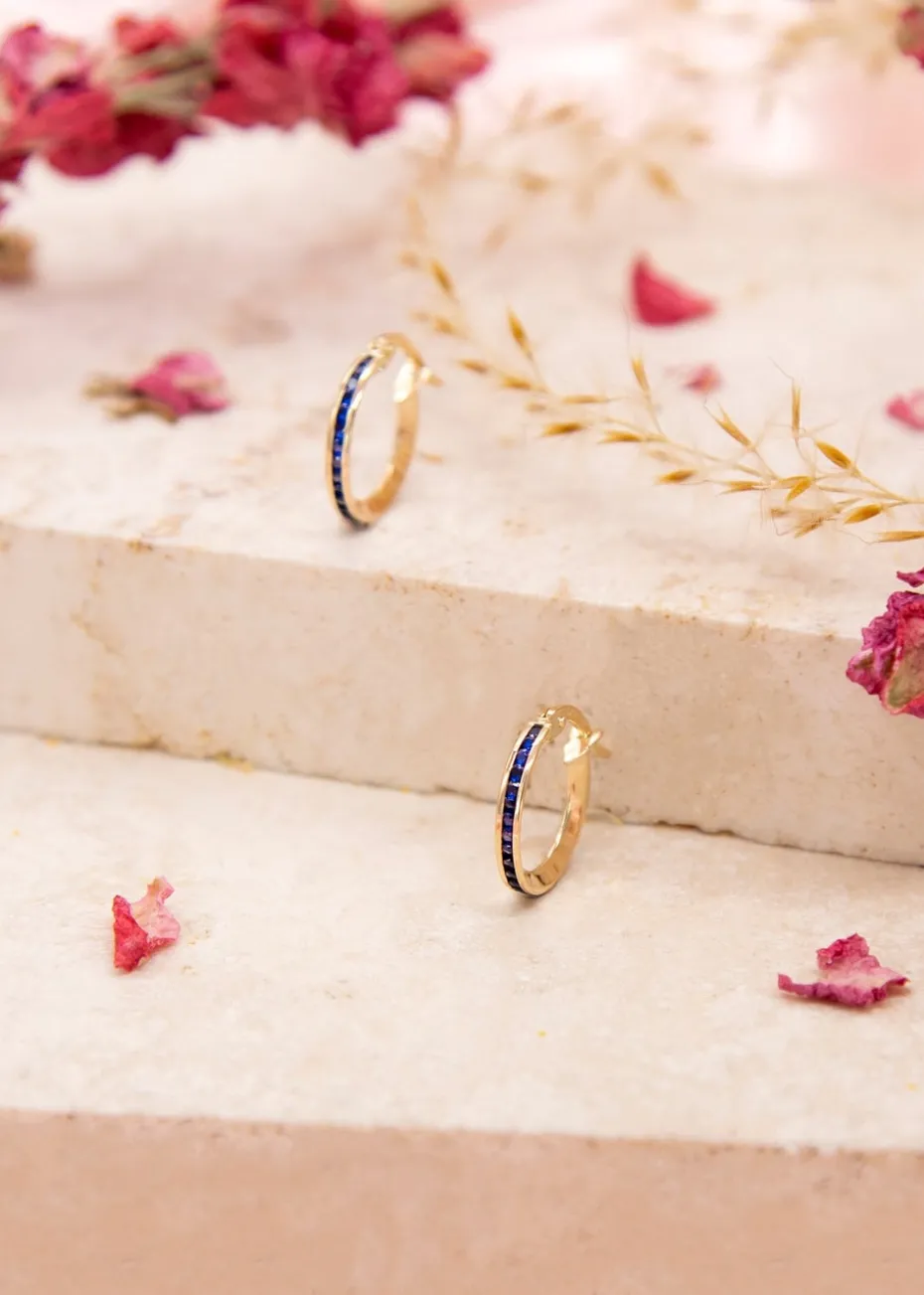 The earrings are adorned with small, 1mm round blue cubic zirconia stones that add a touch of color and sparkle.