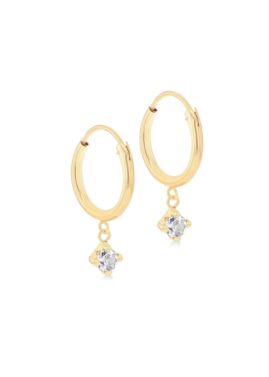 Each earring features a round, brilliant-cut white cubic zirconia suspended within a sleek hoop setting crafted from lustrous 9ct yellow gold.