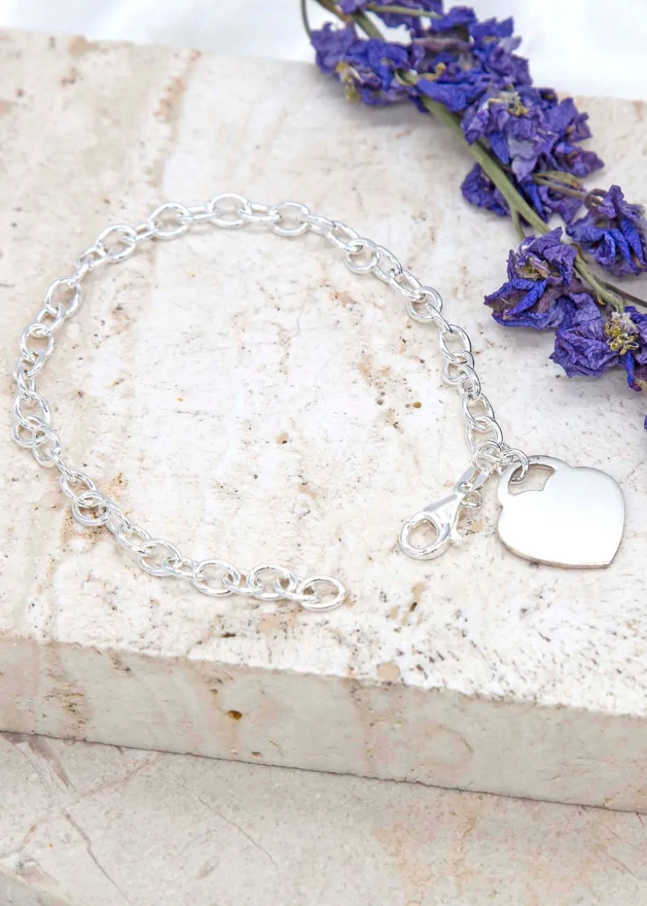 Crafted from sterling silver, it features a classic belcher chain adorned with a heart-shaped charm.