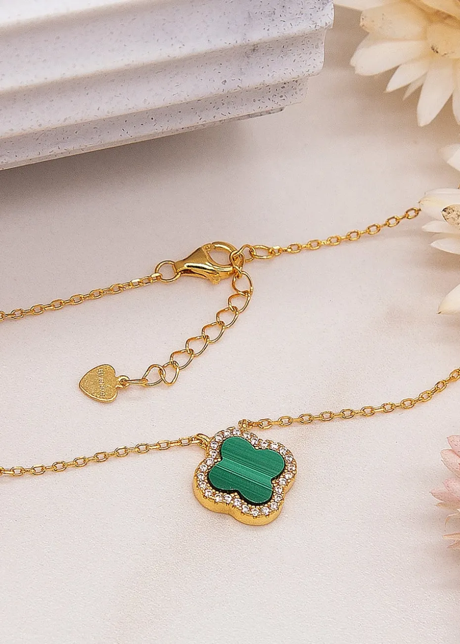 The necklace features a clover-shaped malachite stone, renowned for its deep green color and natural patterns, which symbolize luck and prosperity.