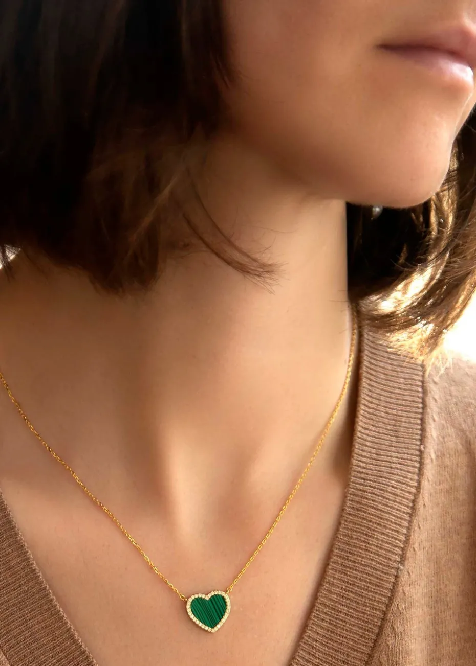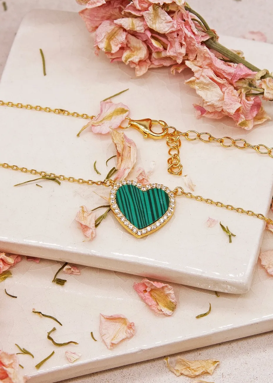 Crafted from sterling silver and delicately plated with radiant yellow gold, this necklace features a heart-shaped pendant adorned with a captivating malachite stone and sparkling cubic zirconia accents.