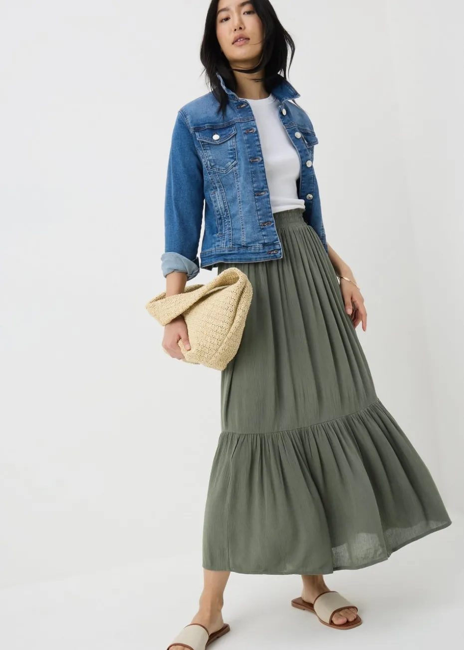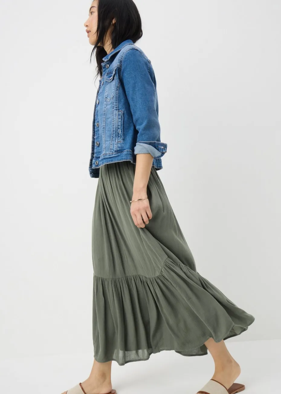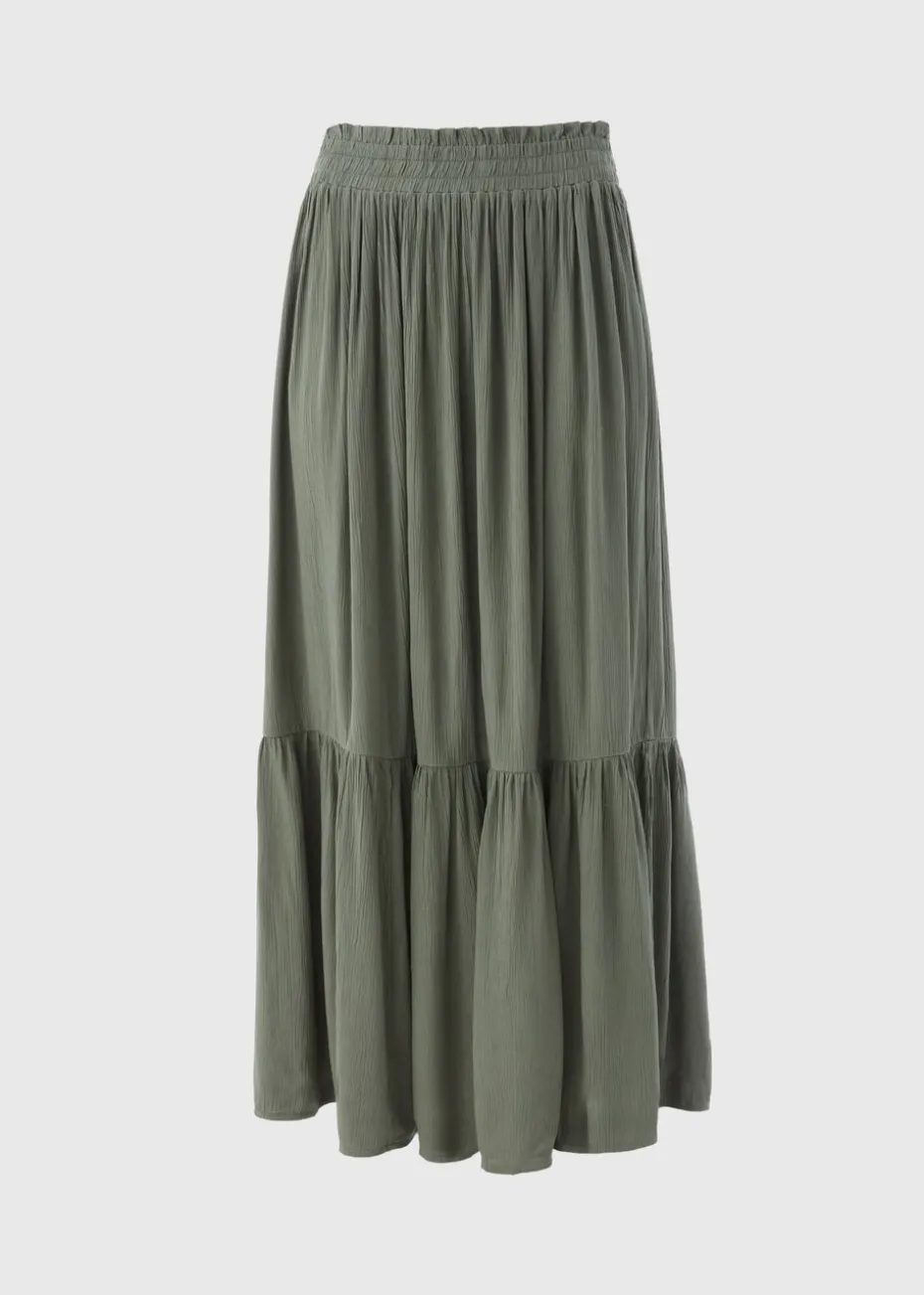 Stay effortlessly stylish this season with our Cheesecloth Maxi Green skirt. Crafted from a soft and lightweight material, this maxi skirt exudes elegance and comfort. Its flowing silhouette lends a touch of sophistication to any ensemble. Pair with a crisp white button-down shirt and sandals. Complete the look with a sunhat and oversized sunglasses for a chic beachside ensemble.