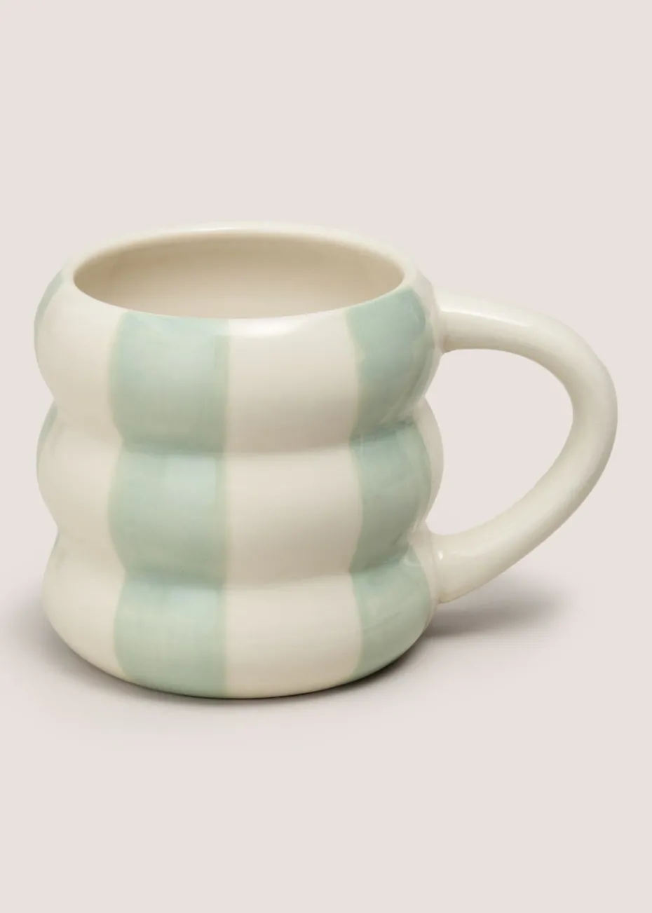 Our Green Stripe Bubble Mug is the perfect way to add a pop of colour and positivity to your morning routine. This cheerful mug features a vibrant green exterior with contrasting white stripes, creating an eye-catching design that is sure to bring a smile to your face. Crafted from ceramic, this mug is built to last and will keep your tea, coffee, or hot chocolate warm and enjoyable.