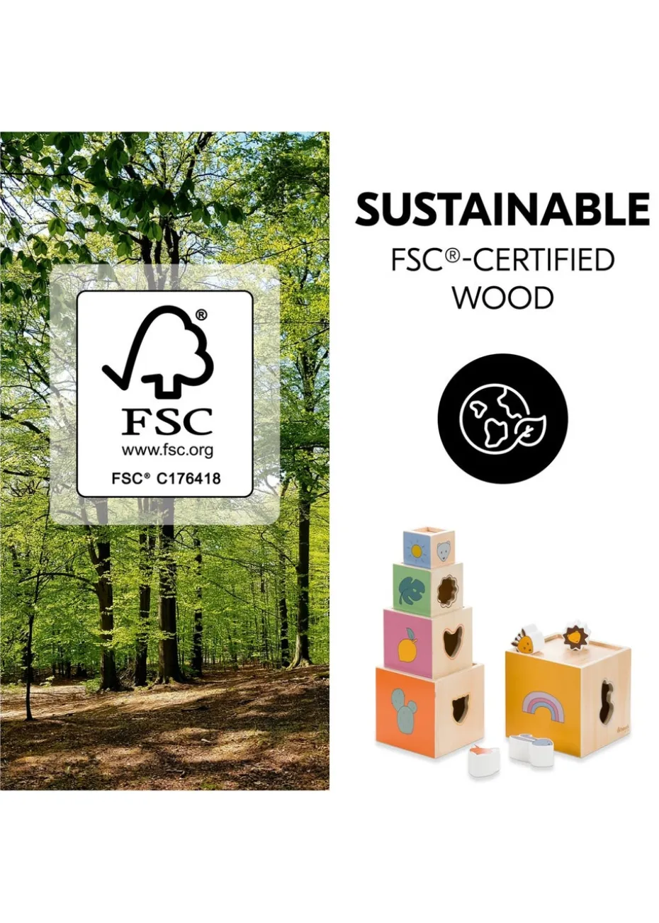 Stack N Raise – Wooden stacking toy promotes fine motor skills and countingPlayful learning of hand-eye coordinationYour child can stack the cubes or place them next to each other and sort the animal bricks into the appropriate opening. By playfully finding out which shape fits into which opening, your child trains the coordination between visual perception and fine motor skills. Your child will learn the difference between awake and sleeping animals and practise counting as there are different numbers of animals on each cube. Sustainable toy made of FSC®-certified woodThe interactive toy is made of wood that derives from FSC®-certified forests and is therefore fun to play with for a long time. We value sustainable and ecological forest use that protects plants and animals.Stacking toy for 1 year oldsThe stacking principle is practical both for playing and for tidying up. To save space, simply stack the cubes upside down and store the animals inside. The stacking game is suitable from 12 months onward and the high-quality workmanship ensures lots of fun and stacking pleasure for a long time, making it a perfect gift for family and friends.