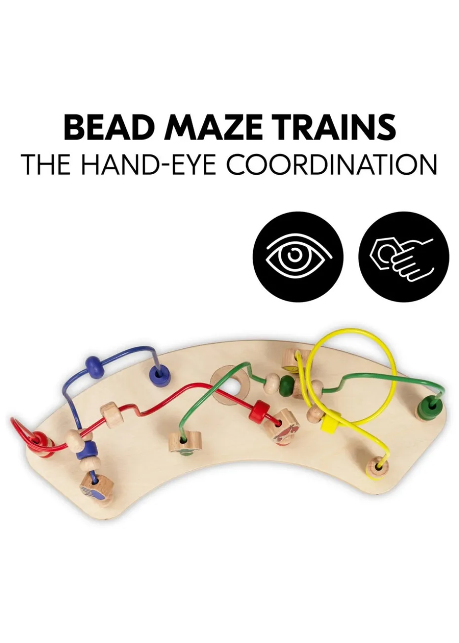 Alpha Play Moving Set – Play tray with bead maze for the Alpha+Play and learning set for your highchair. This set of play tray and motor loop allows you to use your Alpha+ or Beta+ even more flexibly, keeping your child entertained while doing chores. By moving the elements around, your child trains logical thinking, recognition of colours and shapes as well as the coordination between visual perception and fine motor skills. Can be combined with a 2nd toy. The play board can be combined with up to two Hauck toy attachments that can be bought and individually switched, allowing your child to train different skills at the same time. Quick, stable and safe to use. The play tray is clicked on the front bar of the wooden highchair in no time and removed just as easily. The wooden toys can be fixed to the play tray with a wooden screw, preventing them to slip. In order for your child to sit safely even while playing, you can use the play together with the highchair harness. Suitable from 12 months onward. Sustainable materials. The easy-to-wipe highchair tray is made of recycled, GRS-certified material, while the toy is made of durable wood that derives from FSC®-certified forests.