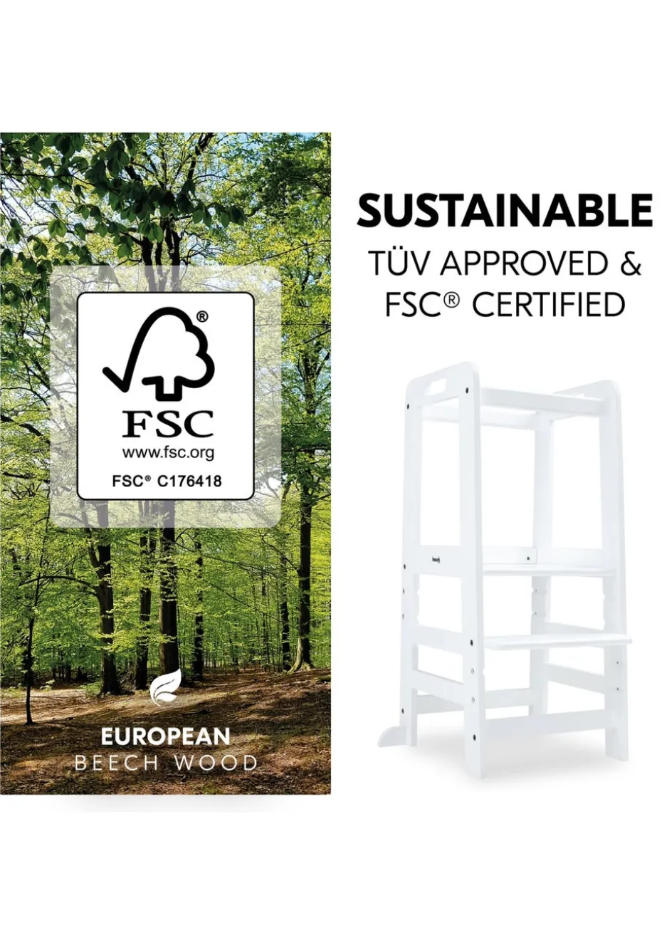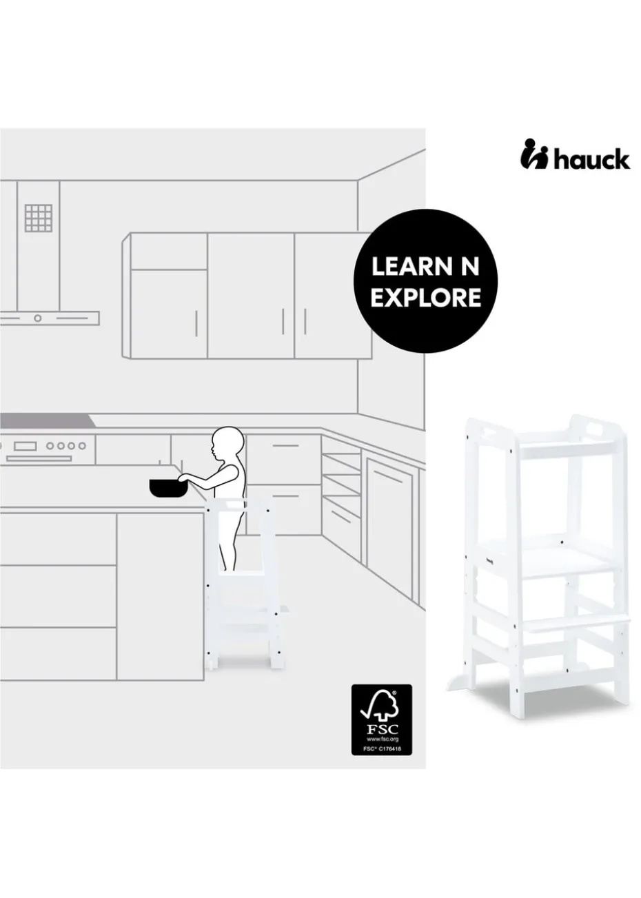 Learn N Explore – The learning tower for independent discoverySustainable, FSCĀ® certified Montessori learning towerThanks to the elevated position of the toddler step stool, your child can do various activities at eye level together with the family. According to the Montessori principle “Help me to do it myself”, your child takes on tasks from an early age through play, e.g. when cooking or baking, strengthening their independence, linguistic and social development as well as their self-confidence. The hauck toddler tower is FSCĀ® certified, which means that the beechwood comes from FSC-certified forests with sustainable forestry.Grow-along, stable and universal towerDepending on your child’s size, you can adjust the foot plate of the kitchen helper into three different heights. The robust and sturdy construction allows your child to use the Montessori tower up to 40 kg, be it in the kitchen, at the dining table or at the bathroom sink.Simple, practical and safe handlingScrews and tools are already included in delivery. The foot plate can be easily adjusted with two screws. The shape and design of the wooden toddler step are adapted to the look of the hauck wooden highchairs to create a harmonious picture in your interior.