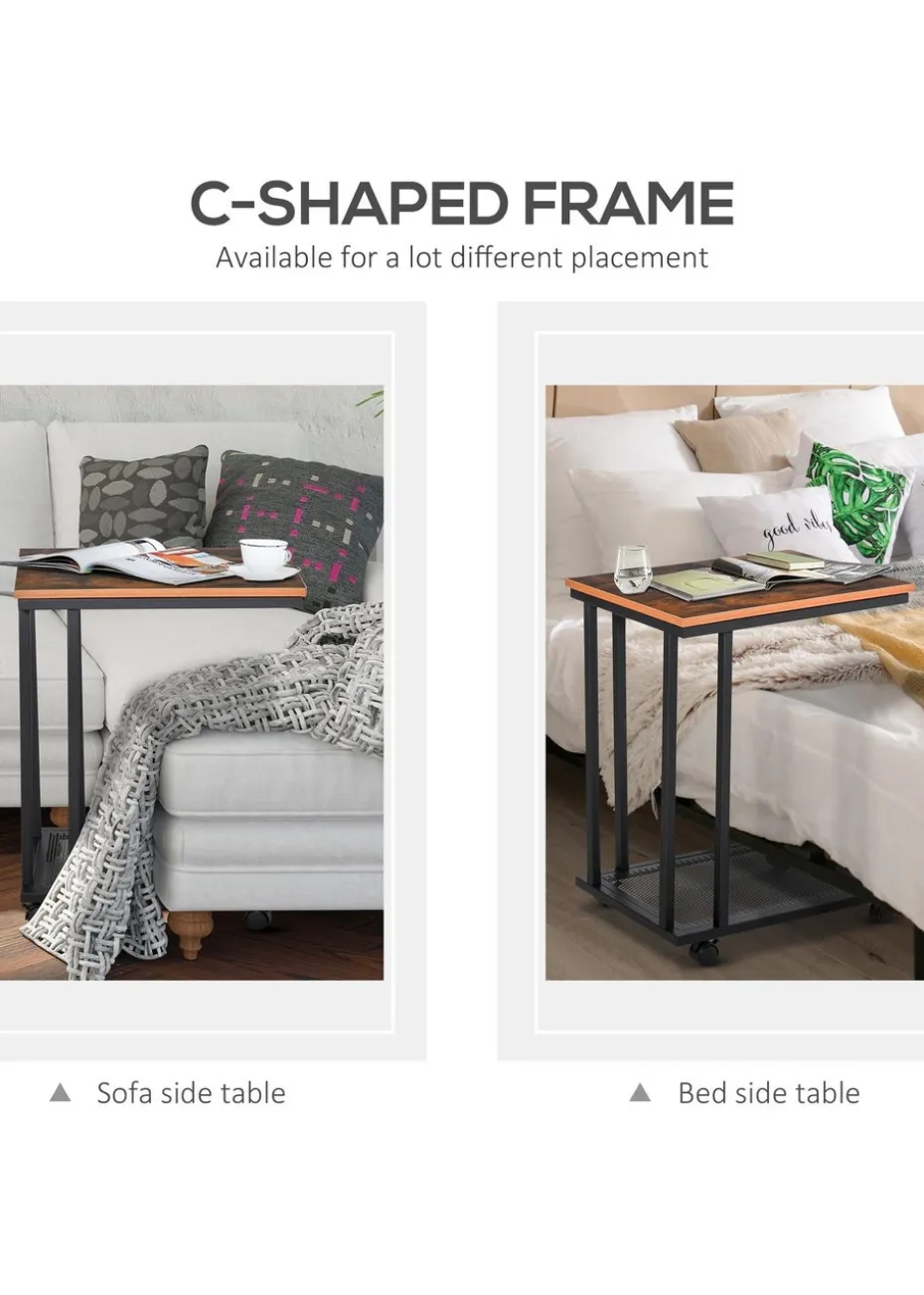 Combining style and convenience, this side table from HOMCOM is perfect for your living room, bedroom or conservatory. Featuring four wheels on the bottom, it can be moved around easily, and its āCā shape means it can slot besides your sofa, chair and bed for complete convenience. The frame and bottom mesh tray are made from sturdy steel, with a sleek MDF worktop in a chestnut brown finish for a stylish addition to your home, no matter the style of dĆ©cor. Item Name: Side Table Brand Name: HOMCOM Material Used: MDF, Steel Tube Colour: Wood Grain colour, Black Product Dimension: 51L x 36W x 65Hcm Gross Weight: 5.6 kg Net Weight: 5 kg Weight Capacity: 10 kg Flat Pack: YES Custom Label: 833-606
