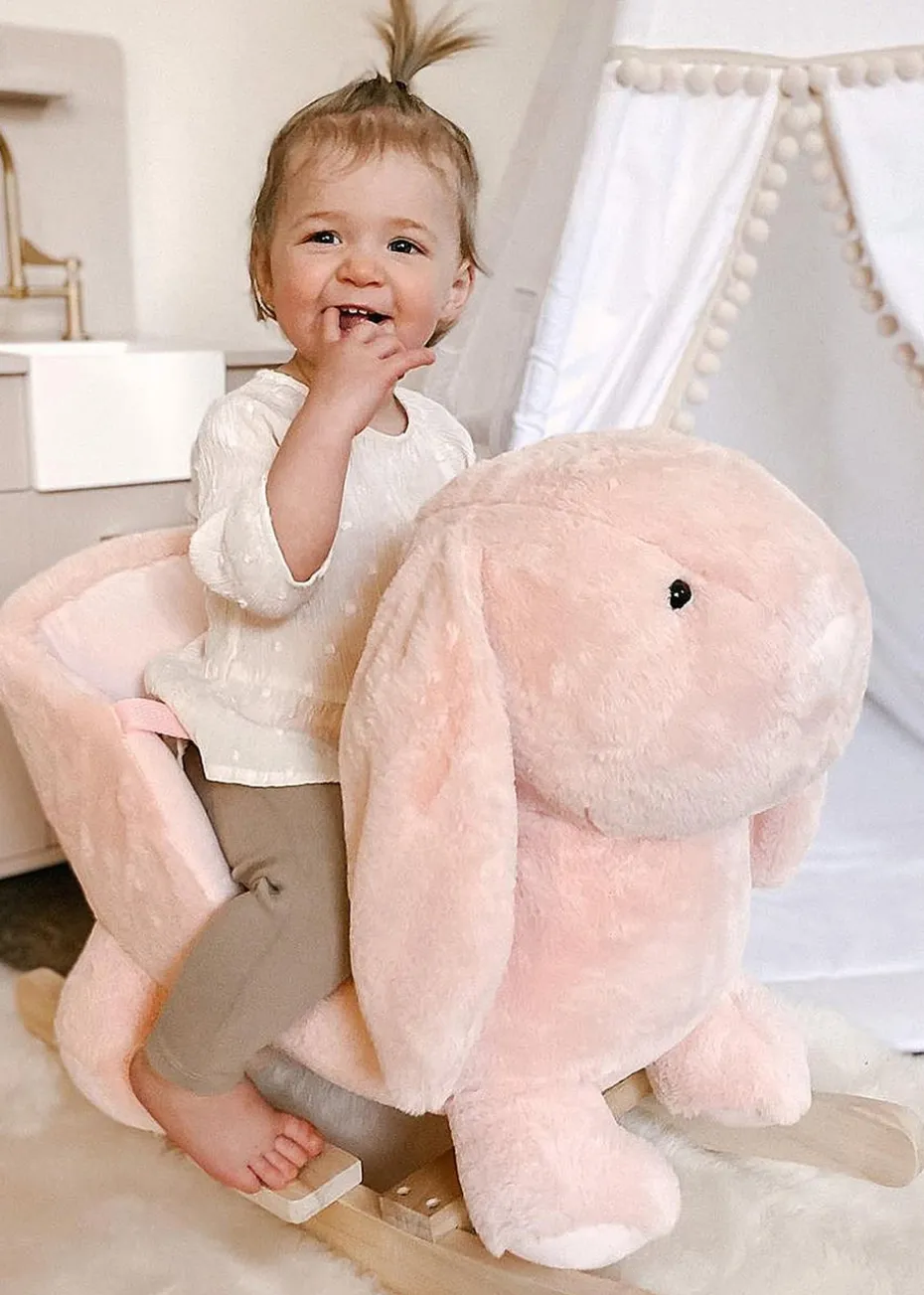 Putting a cute spin on a classic rocking horse, this rabbit ride-on will instantly make your child’s day. The seat frame is made from metal – it’s solid and sturdy for safe continual use, covered in soft pink plush and made into a cute long-eared rabbit. It features a large seat for them to sit on, a high back to offer body support and two handlebars for them hold on to. On the ear, a sound button is placed which makes cute and realistic sounds for extra fun. It’s finished with a thick rocking base which moves the rocker forwards and backwards gently. 3 x LR44 batteries are required and are included. – Solid steel frame to keep the shape, with a curved wood base which rocks back and forth gently – Features an easy-grip front handlebar, footrests and seat belt for safety – Cute rabbit seat in plush is soft and smooth to the touch – Long ears with a sound button which plays realistic and fun effects – Wide seat for your child to sit comfortably – Assembly required – Certifications: EN71-1.2.3 and EN62115 – Custom label: 330-112